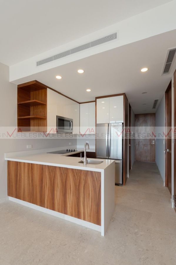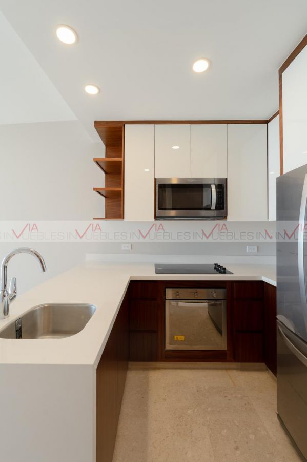 El departamento cuenta con amplio balcón, sala, comedor, cocina con madera de pino y chapa de madera de parota, totalmente equipada con electrodomésticos de alta gama y cubierta de cuarzo.