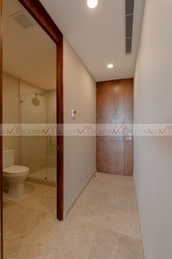 Recámara principal con vestidor de madera de pino con chapa de parota y baño completo con cancelaria de vidrio templado de 9mm. Herrajes de acero inoxidable.