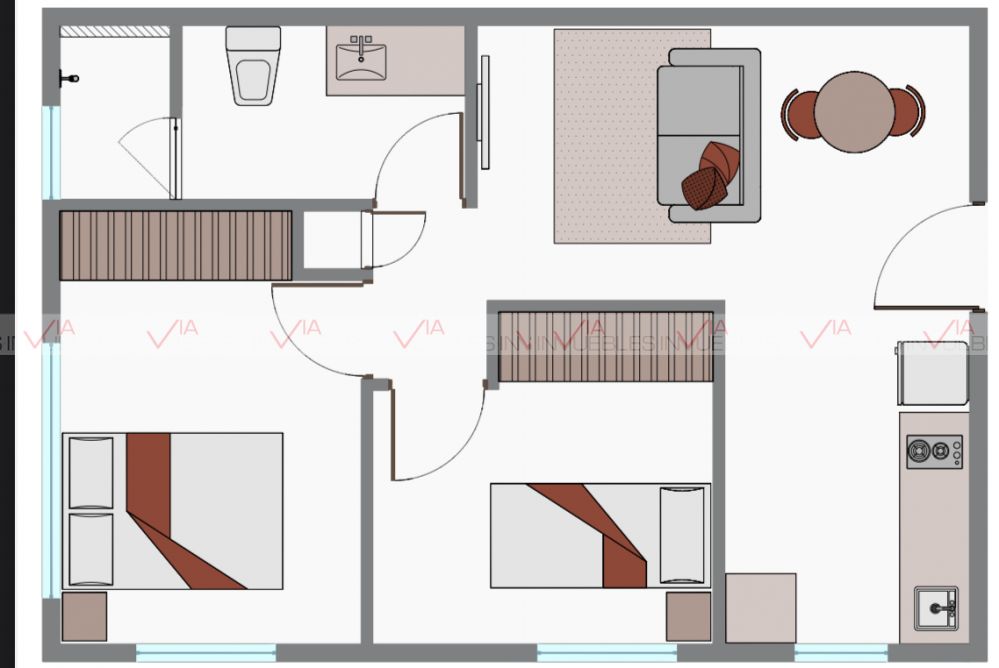 Características del departamento: 42.10 m² de construcción, 2 recámaras amuebladas, 1 baño completo, cocina equipada, área de sala con televisión, totalmente amueblado, listo para mudarse