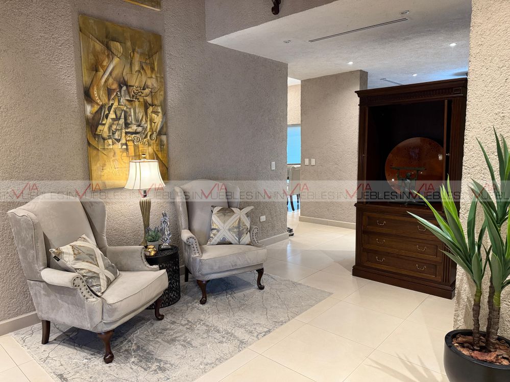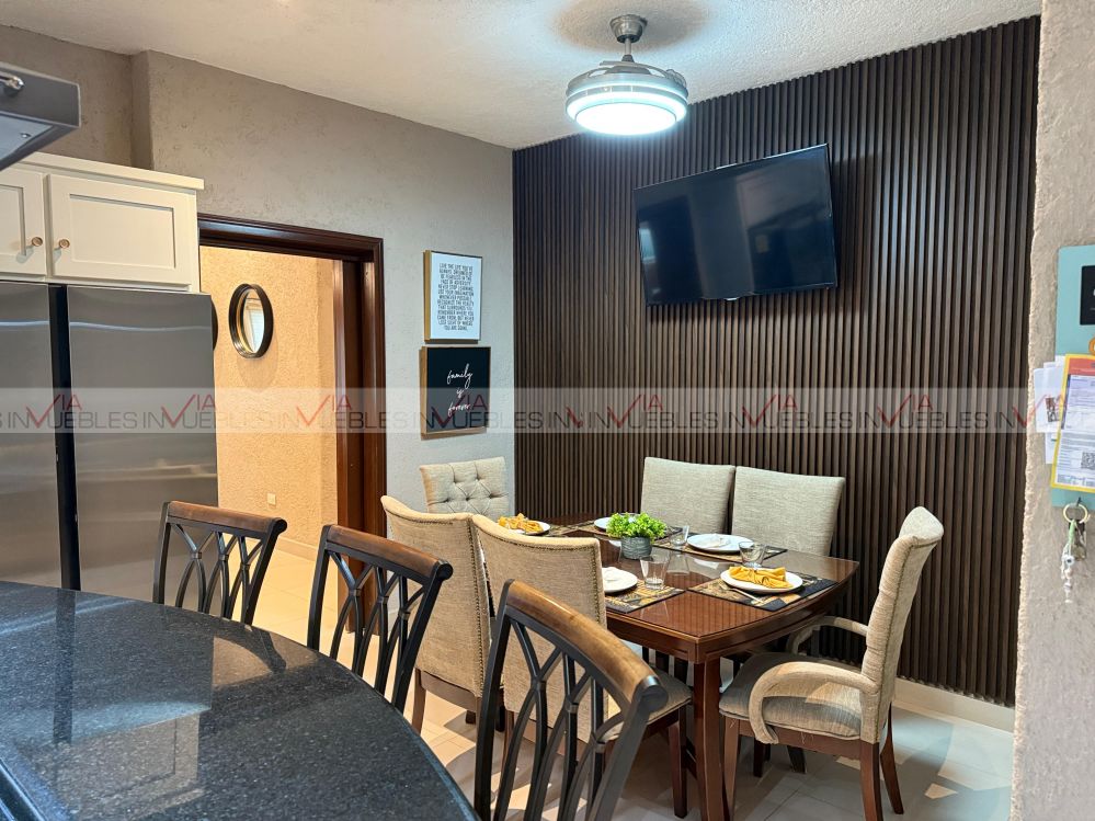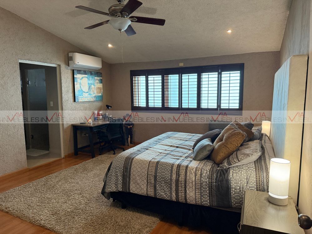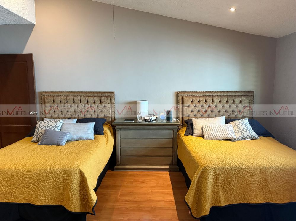 Hermosa residencial de 4 recamaras una de ellas en planta baja, cuenta con seguridad 24 horas, áreas de juegos en amenidades, 3 recamaras con walking closet, 5 baños, portón electrico, estacionamiento para 3 carros, 450 metros de terreno y 570 de construcción, sala, comedor, cocina equipada completamente amueblada, oficina, gym, lavandería, cuarto de servicio, alacena, muebles de madera empotrados, recibidor, pequeña terraza, area de asador y jardín lista para habitarse