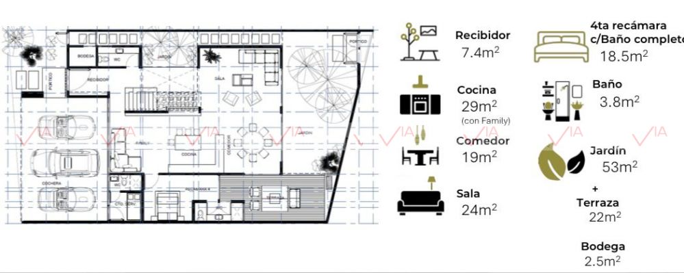 Planta Baja: 1 recamara en pb con baño completo, cuenta con recibidor, bodega, espacio de terraza, cocina, sala-comedor, acabados premium en mármol Santo Tomas y granito. Cuarto de servicio con baño completo. Cochera para 3 autos. Preparación solar y carro eléctrico.