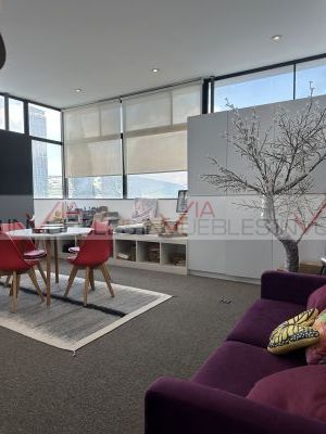 Área social con muebles empotrados en maderas finas y bufetero con cubierta en cuarzo, integrada a un jardín de aproximadamente 50m2.