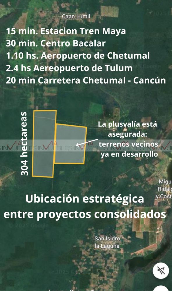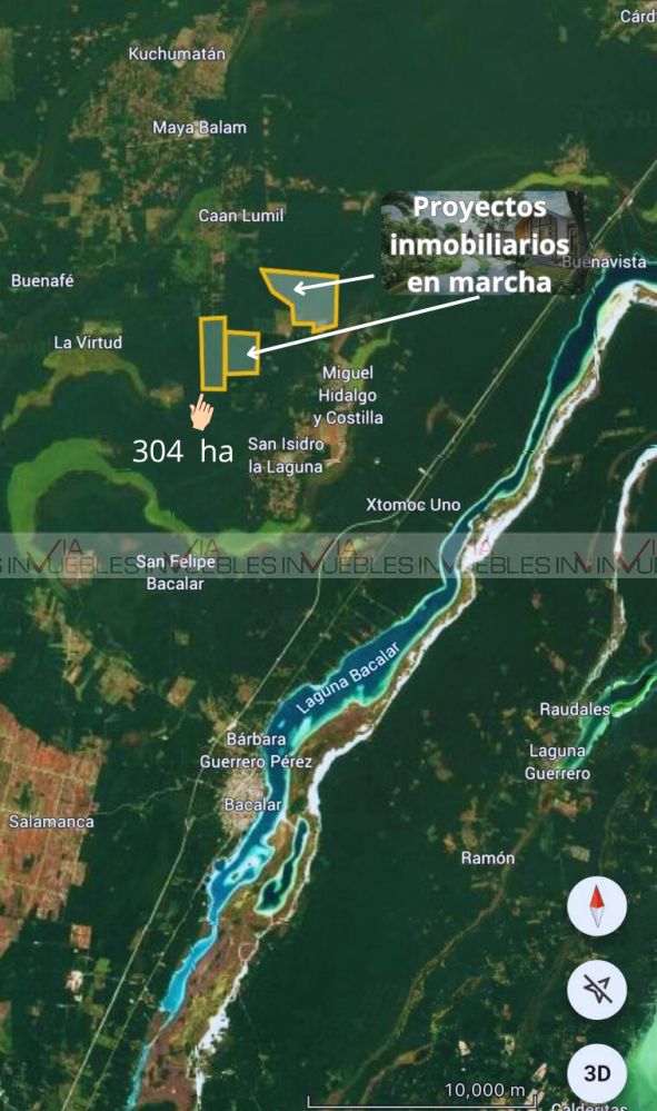 Se ofrece en venta terreno de 304 hectáreas en Bacalar, Quintana Roo, un destino turístico consolidado desde 2011 y con un crecimiento inmobiliario acelerado alrededor de la Laguna de los Siete Colores, sus cenotes, canales de los piratas, centro histórico y hoteles boutique.