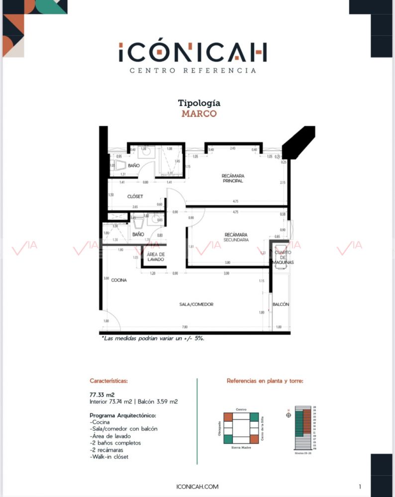 Distribuido en sala, cocina equipada, lavasecadora, 2 recámaras, la principal con baño y vestidor la otra recamara comparte baño completo con el área social, balcón, 1 cajón de estacionamiento.