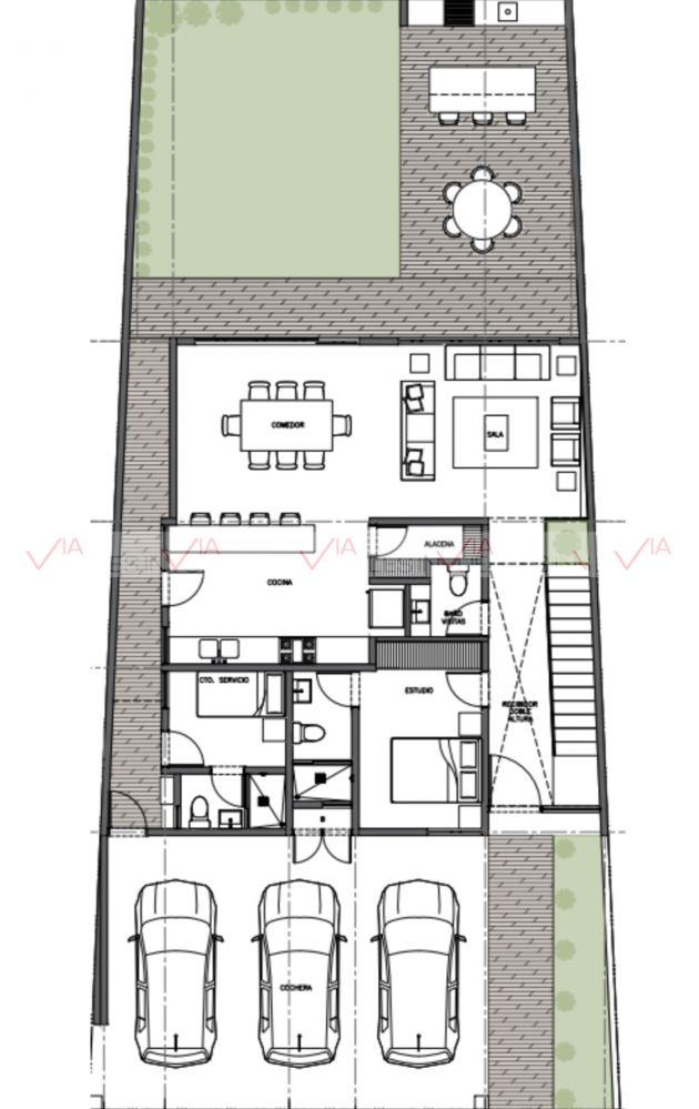 La casa consta de cochera para tres autos, recibidor de doble altura, baño de visitas, amplia sala/comedor con vista al jardín, cocina abierta, cuarto se servicio con su baño completo. Amplio patio con espacio para asador.