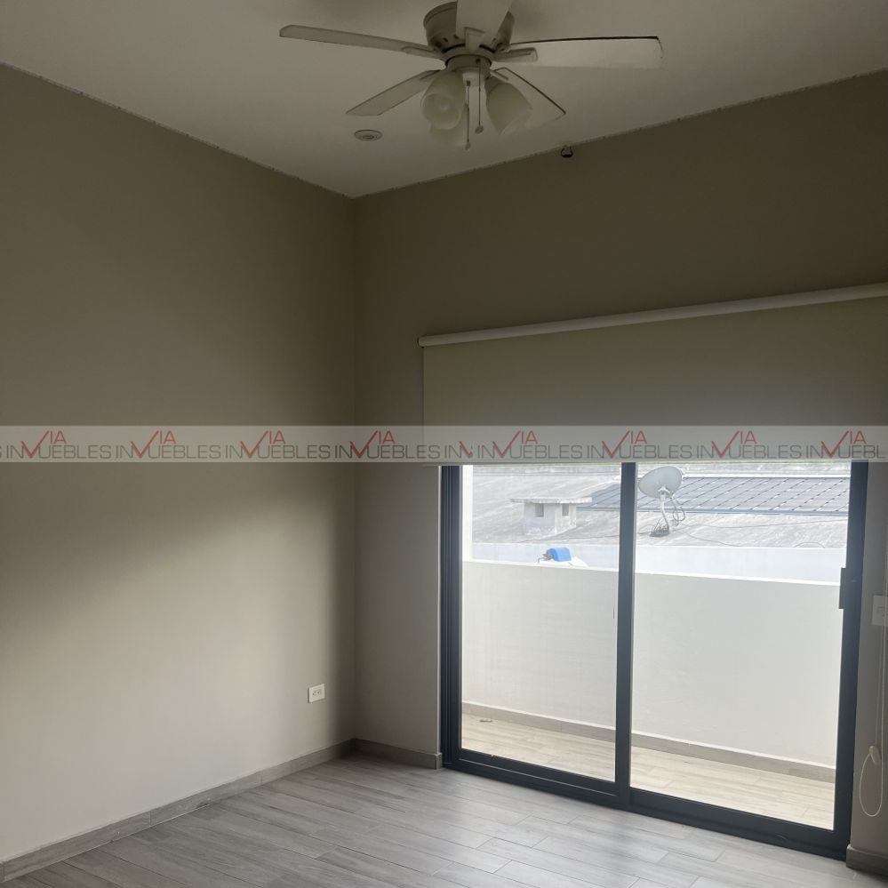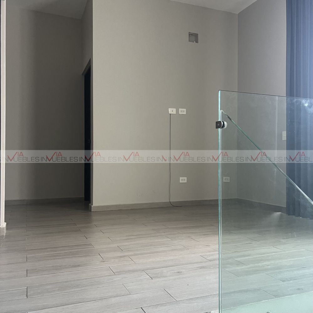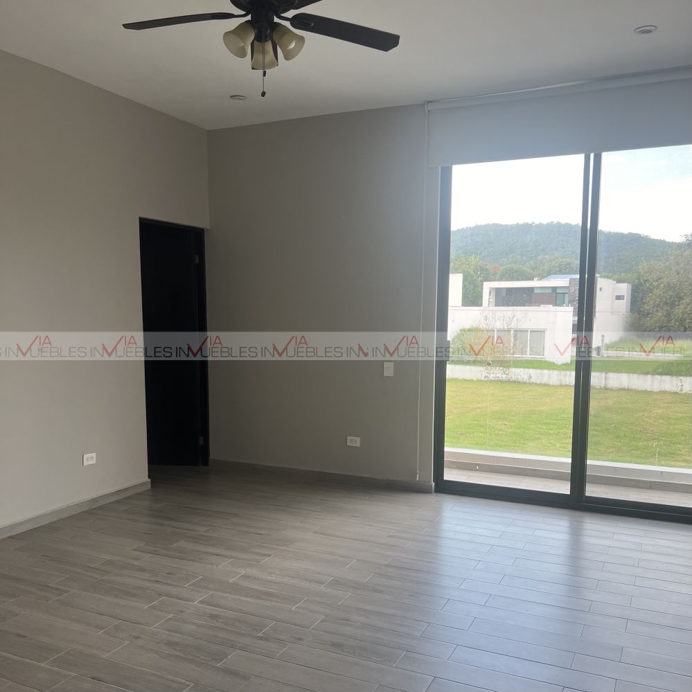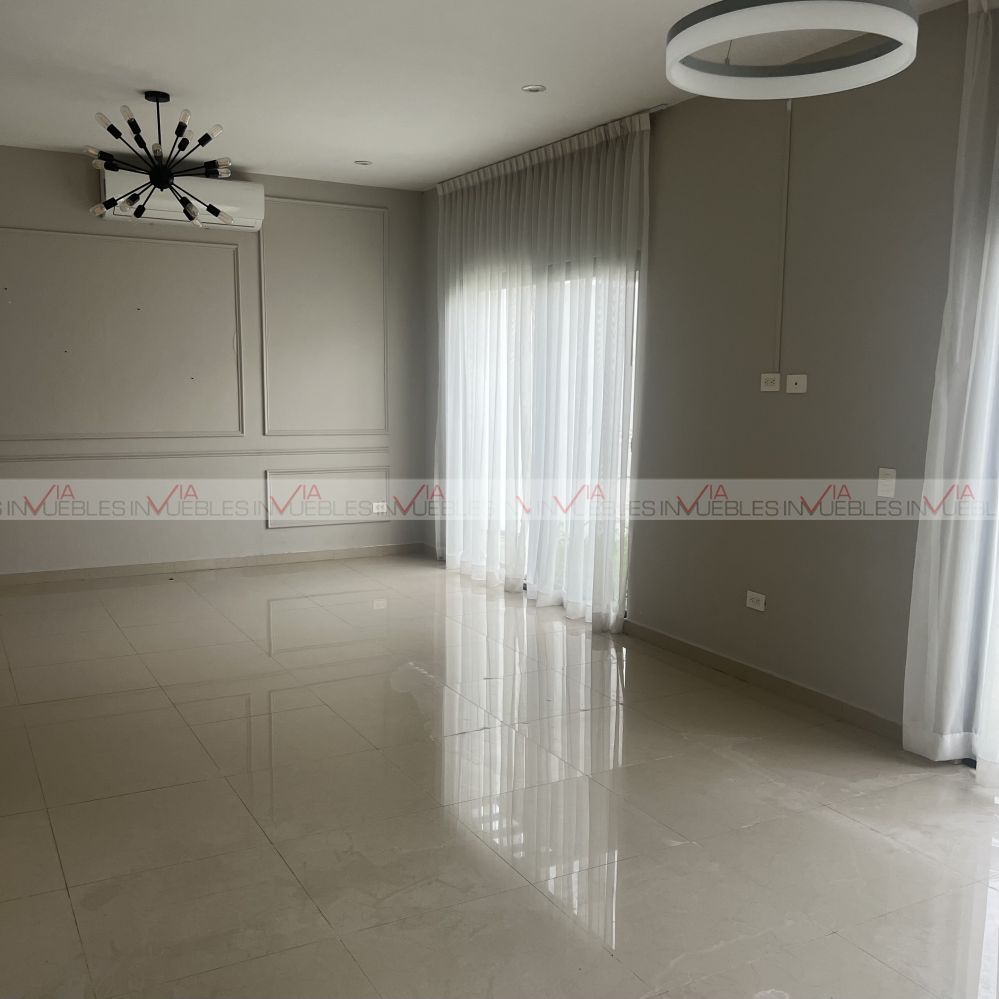 Renta esta hermosa casa en el Cercado Santiago, N.L., con una construcción de 300 metros cuadrados en un terreno de 230 metros cuadrados. Con 3 amplias recámaras, cada una con balcón, minisplits, abanicos de techo, baño completo y walking closet, esta propiedad cuenta cocineta equipada con parrilla, campana, micro ondas, horno y refrigerador, lavandería con centro de lavado, boiler y cámaras de seguridad, cortinas y candiles en sala comedor, persianas black out en recámaras y family room. Amplio patio con barra de concreto, tarja y asador, 2 cajones de estacionamiento. Se aceptan mascotas. Disfruta de esta casa con todas las comodidades y hermosas vistas frente a parque.