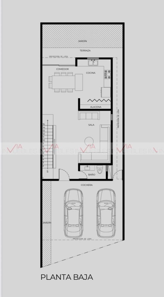 Planta Baja: cochera doble, baño de visitas, sala, comedor, amplia cocina y patio.