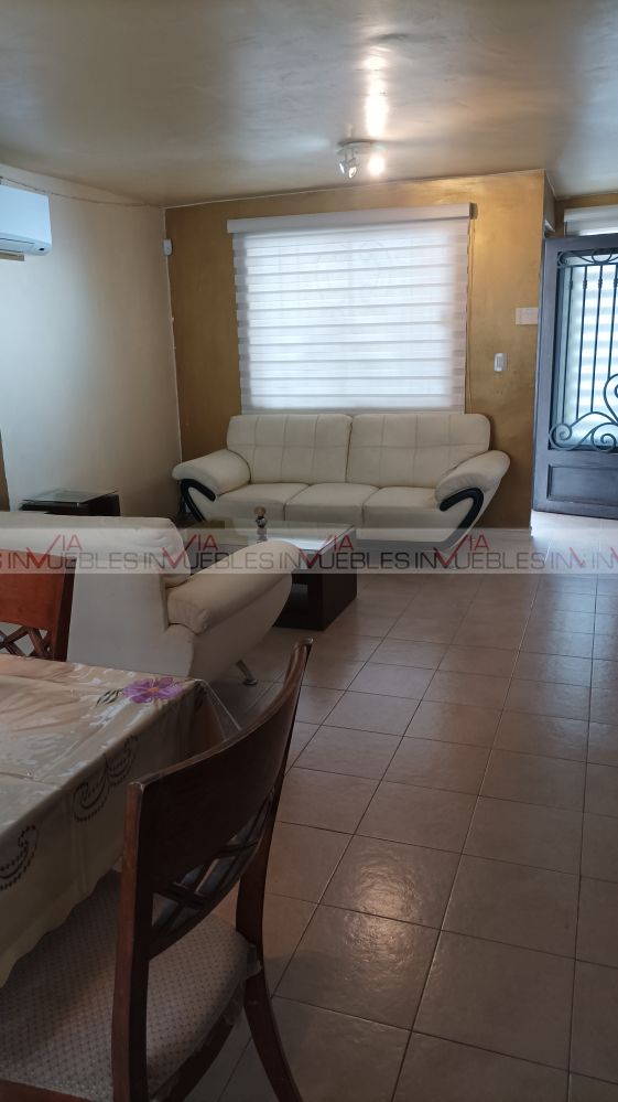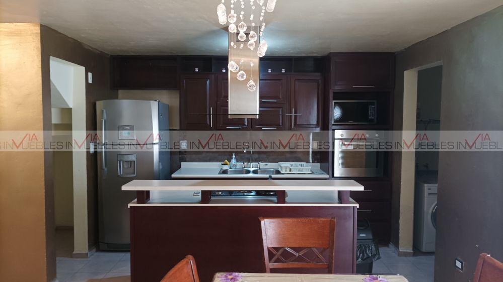Preciosa casa en renta, equipada y amueblada, en la colonia Misión de Santa Catarina, en el municipio de Santa Catarina Nuevo León, con excelente ubicación frente a parque, en una zona muy tranquila, segura y con buenos vecinos. La casa cuenta con 2 plantas, de 3 recámaras con duela laminada, 2 baños completos y un medio baño, lavandería, cochera para 2 autos y patio. Descripción: En la primer planta está la cochera sin techar, sala comedor con minisplit de 2 y media toneladas, cocina integral con parrilla, campana, horno, refrigerador y barra; medio baño actualizado con mueble en lavabo, lavandería equipada con lavadora y secadora, tallador, boiler, tiene puerta trasera de seguridad, y patio amplio. En la segunda planta está la recámara principal con minisplit, closet vestidor, baño completo con regadera remodelada, 2 recámaras secundarias, 1 de ellas con minisplit, que comparten baño completo. La cochera no es techada, cuenta con protectores en ventanas, barandal en pasillo, muy cerca de colegios.
