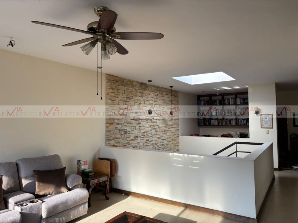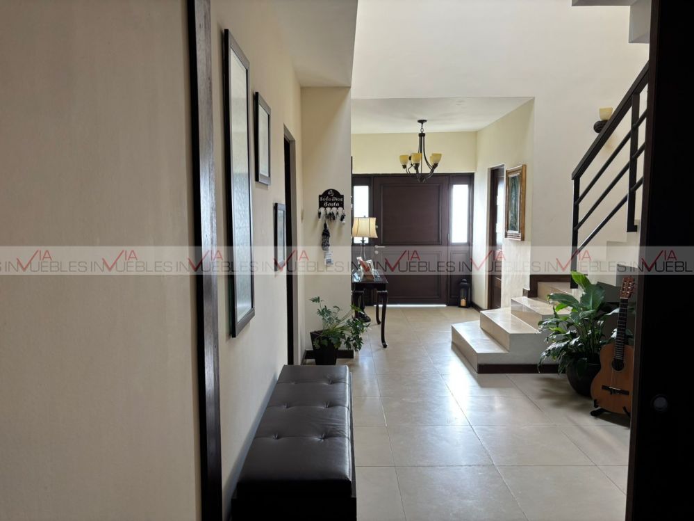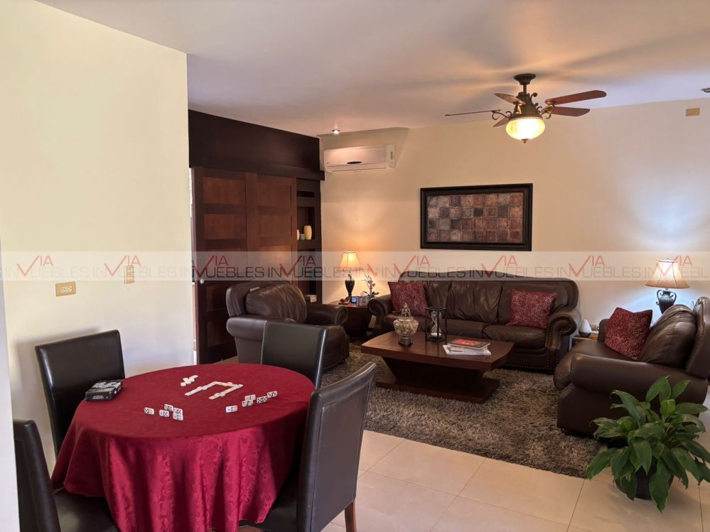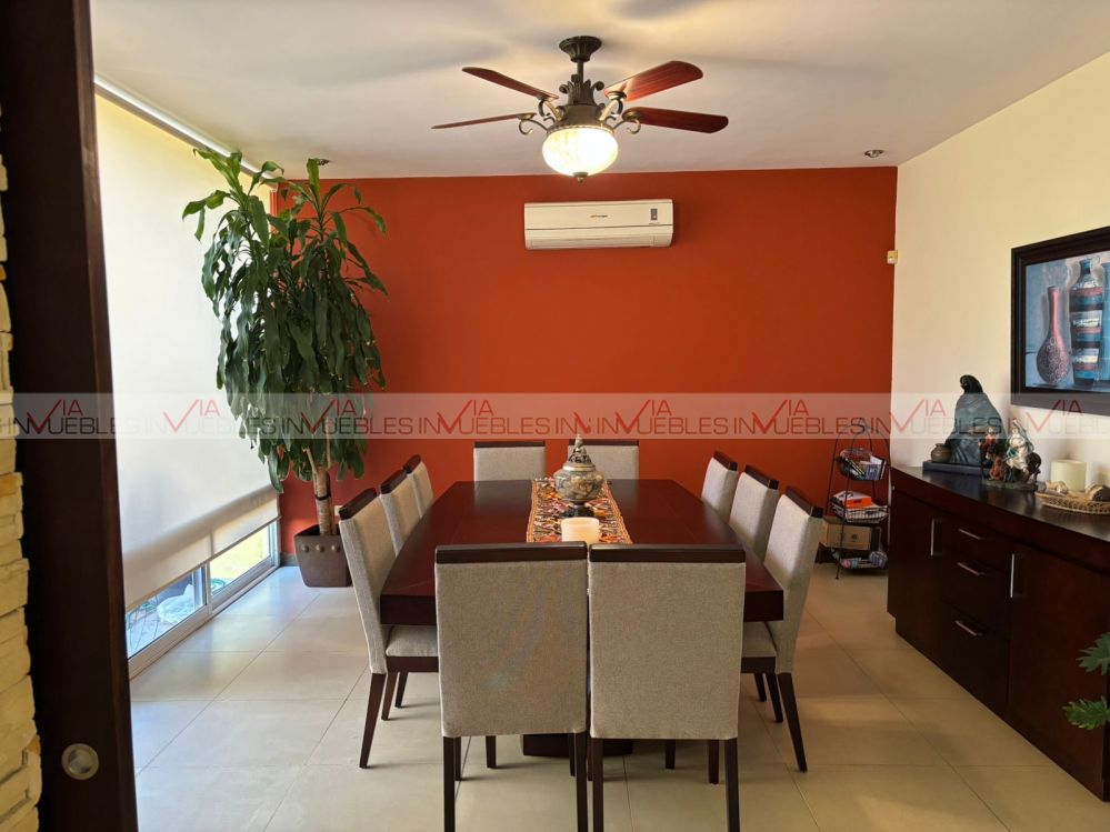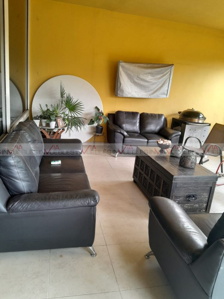 Hermosa residencia en venta dentro de un fraccionamiento privado con caseta de seguridad en carretera nacional cerca de escuelas, hospitales y centros comerciales, con un frente de 12 metros, el garaje ofrece 3 lugares de estacionamiento, amplia estancia de sala y comedor con puertas corredizas de madera para dar mayor privacidad en las áreas.