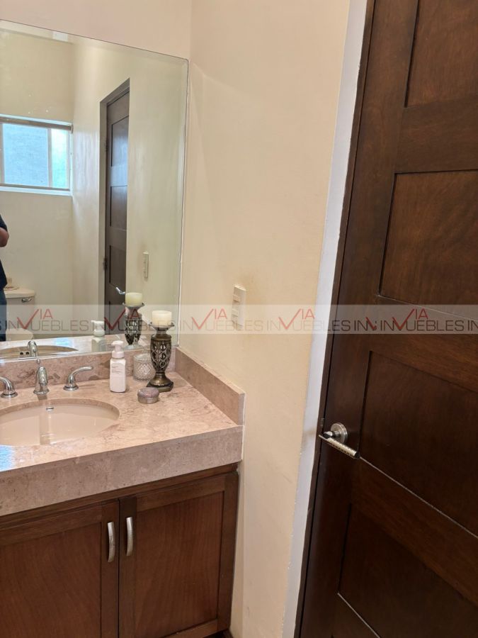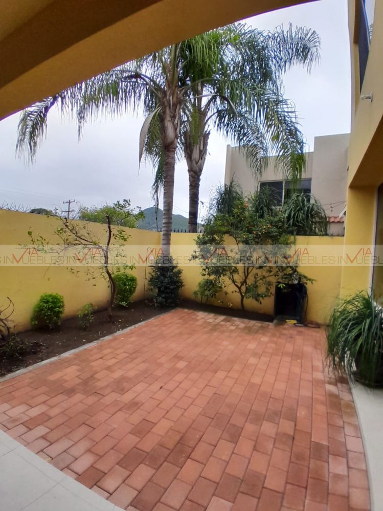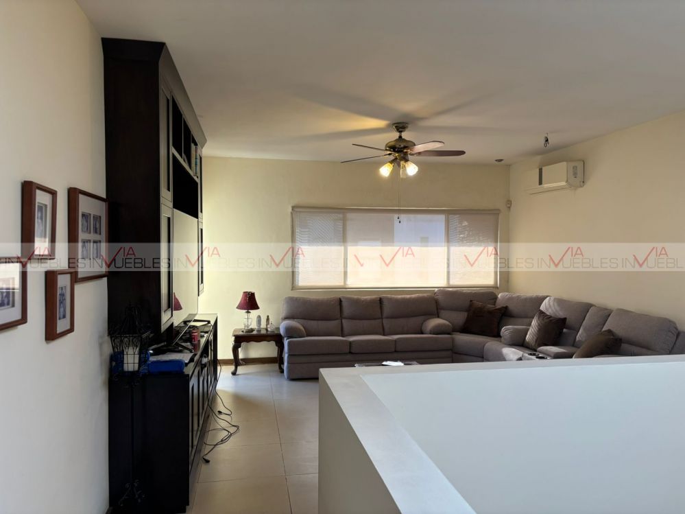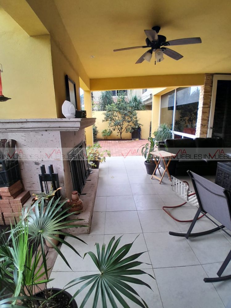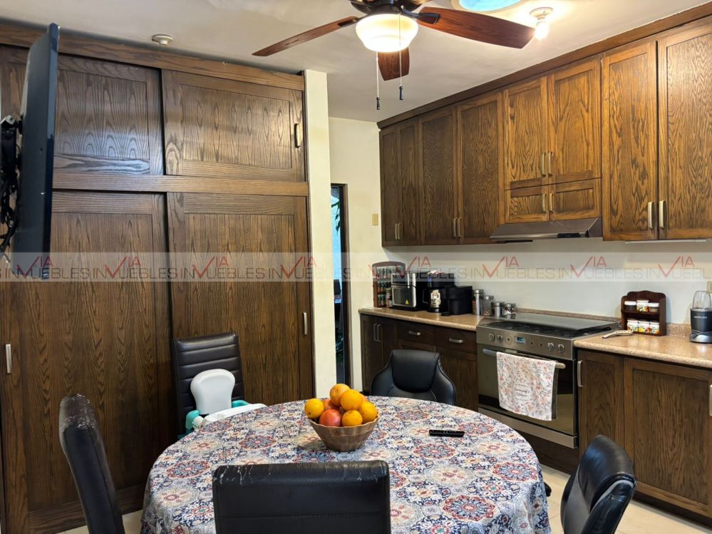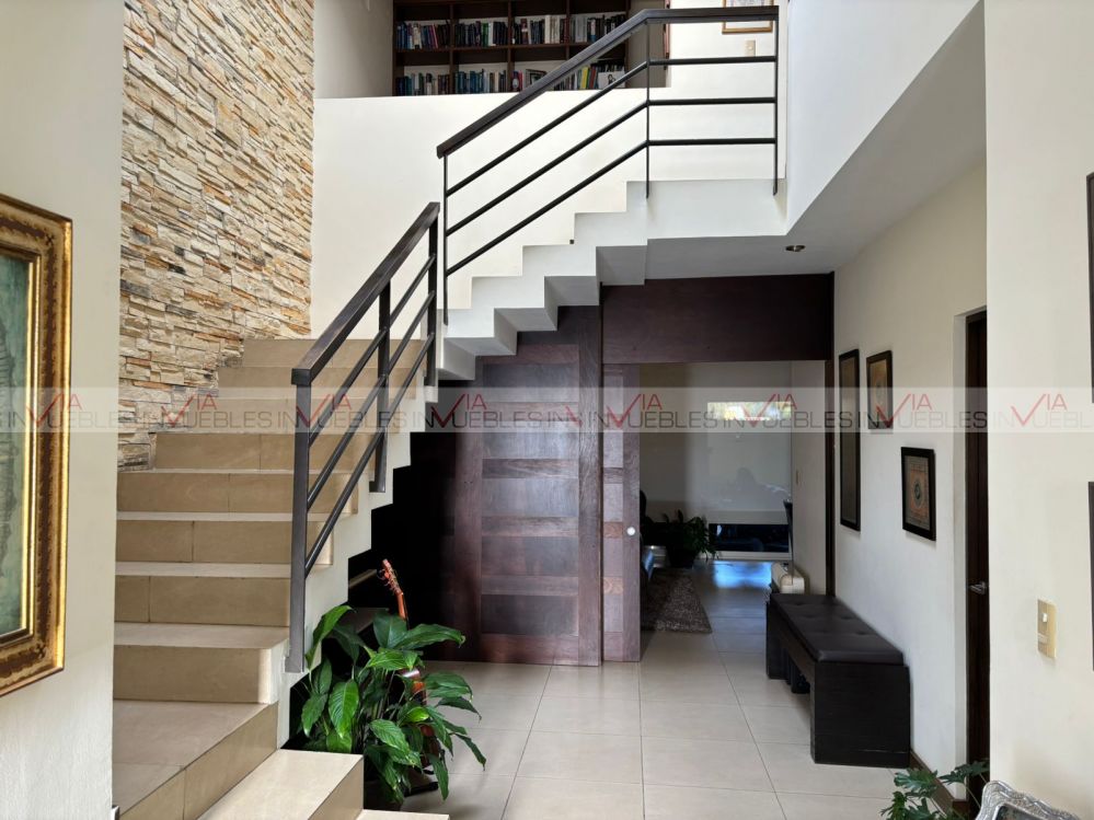 Hermosa residencia en venta dentro de un fraccionamiento privado con caseta de seguridad en carretera nacional cerca de escuelas, hospitales y centros comerciales, con un frente de 12 metros, el garaje ofrece 3 lugares de estacionamiento, amplia estancia de sala y comedor con puertas corredizas de madera para dar mayor privacidad en las áreas.