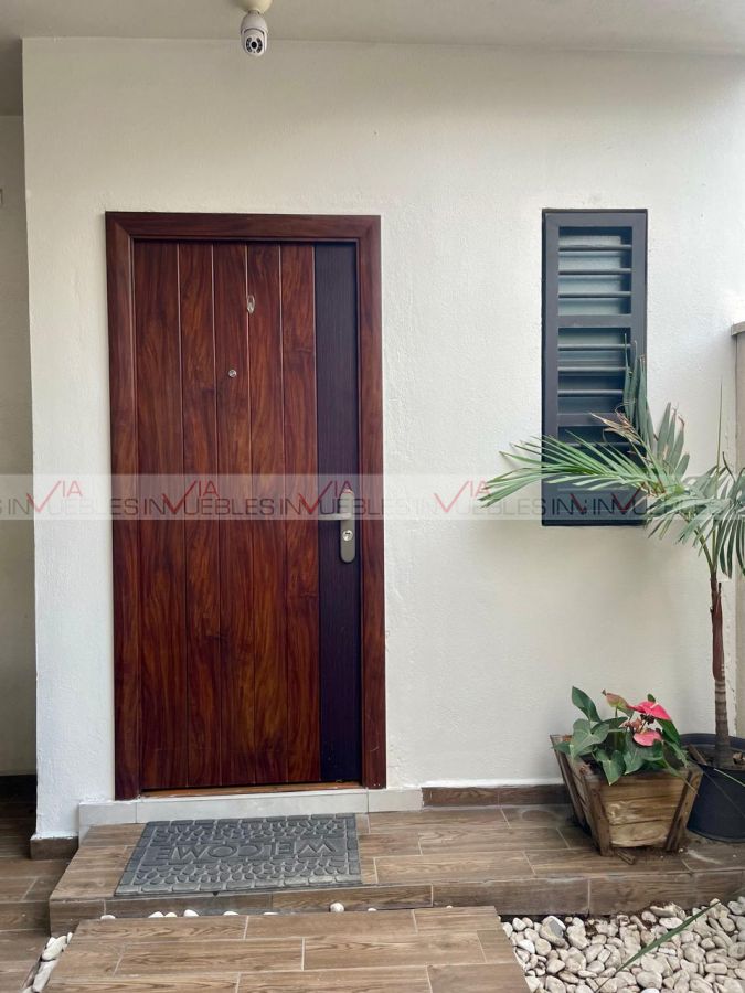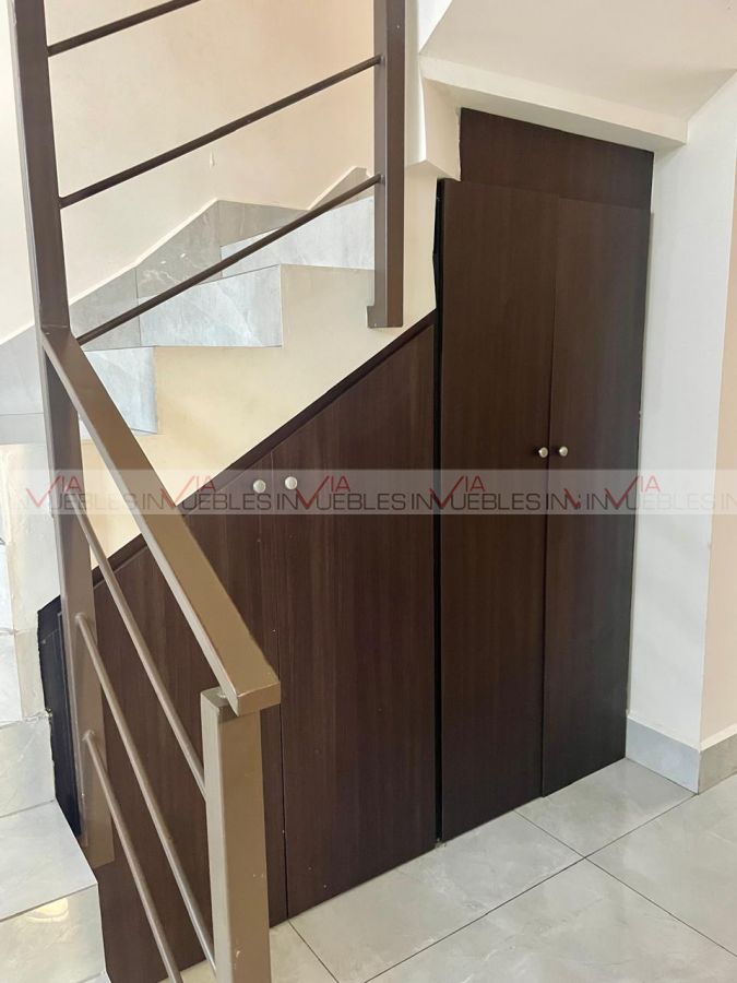 Planta baja: cochera techada para 2 vehículos, recibidor, baño de visitas, bodega bajo la escalera, sala, comedor, cocina equipada recién remodelada, lavandería cerrada, pasillo de servicio y patio con vitropiso.