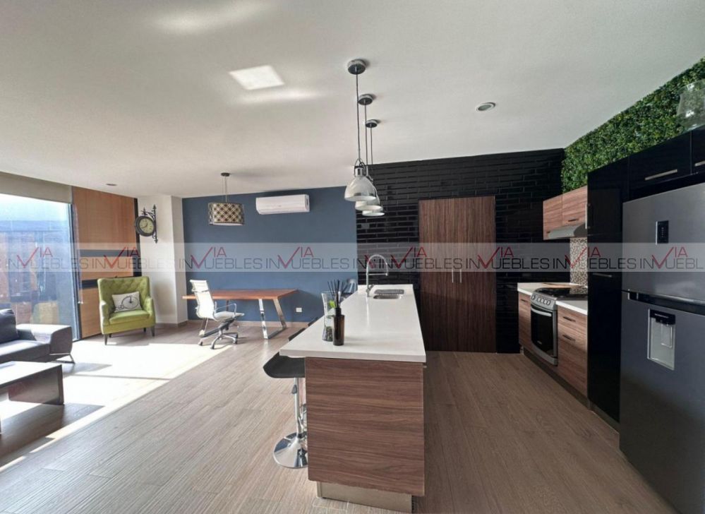 Departamento amueblado de73 mts. En Torre exclusiva con acceso desde la calle principal de la Plaza de Nuevo Sue con vista al cerro de la Silla. Consta de 1 recámara, 1 baño completo, 1 cajón de estacionamiento, cocina con barra de Corian, estufa, refrigerador, centro de lavado, minisplit, clóset, base de cama, librero, sala y mesa de comedor