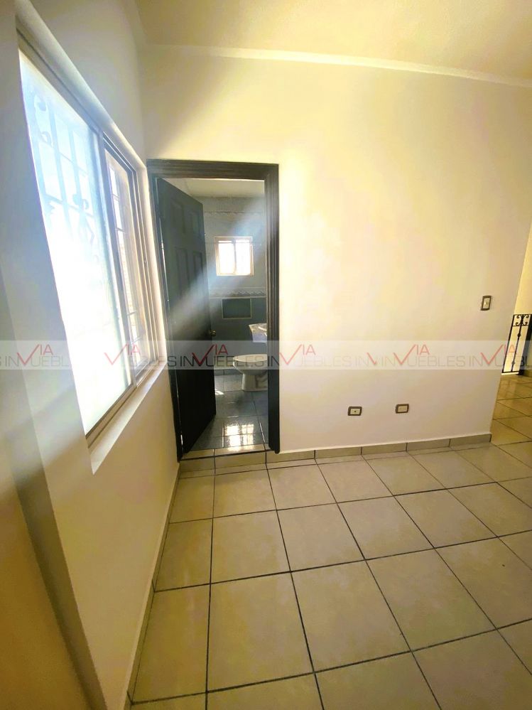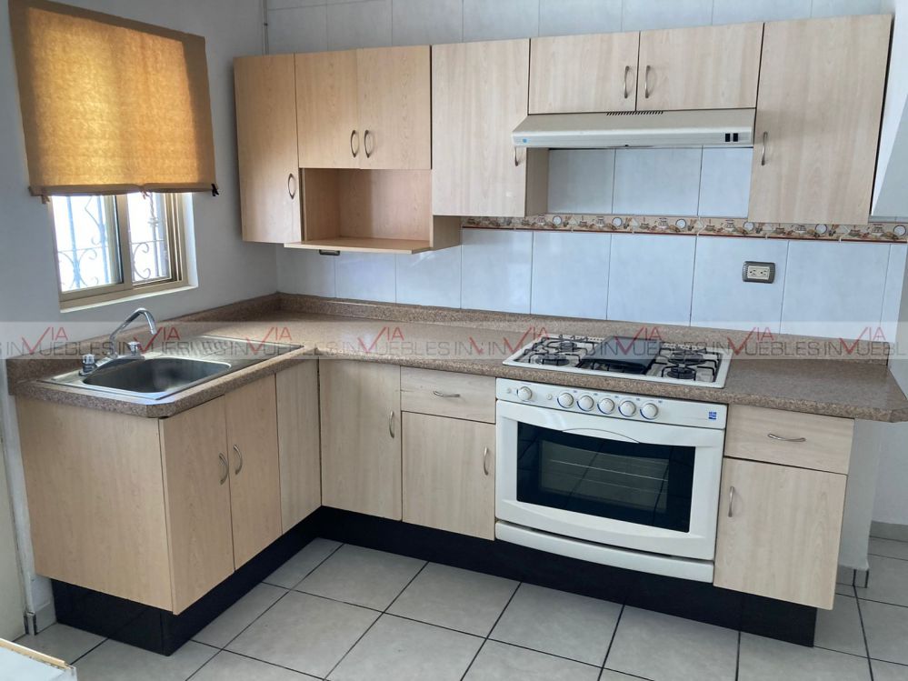 Planta baja: sala-comedor de concepto abierto, medio baño, cocina integral con estufa. En exteriores, amplio patio trasero con pasillo que conecta con el frente, estacionamiento para 2 autos y jardín.
