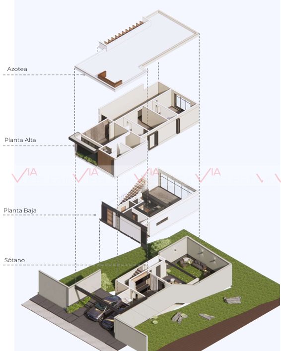 Sótano: lavandería, bodega, sala, terraza, 1/2 baño, jardín.