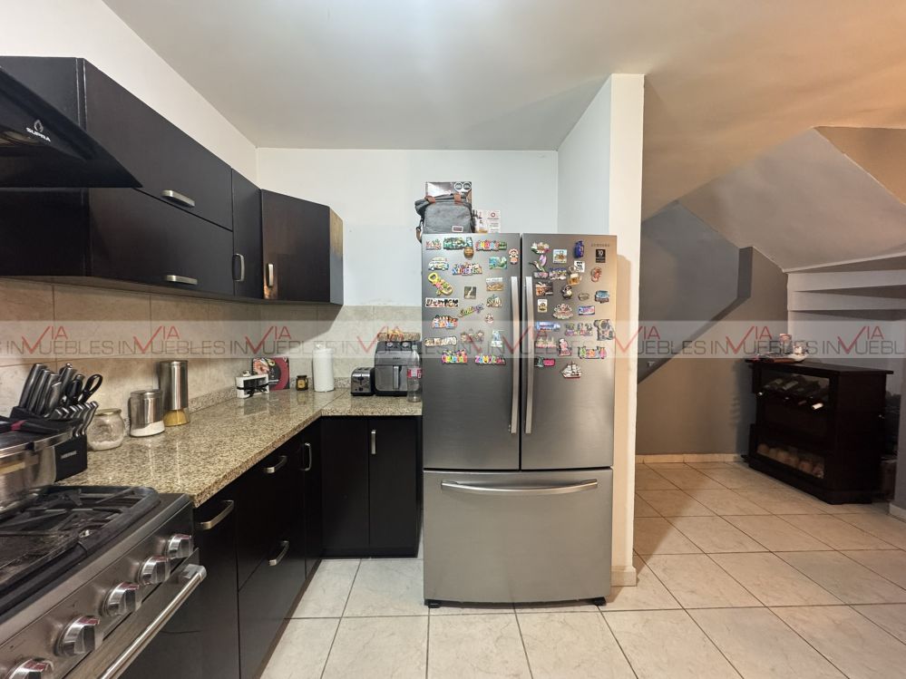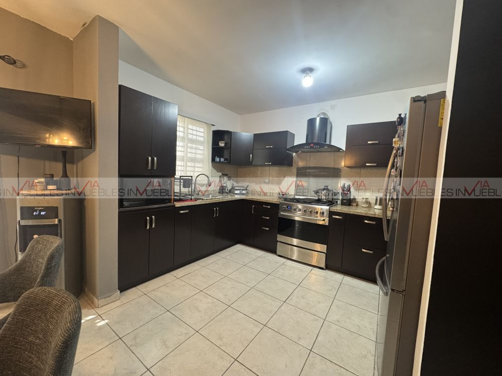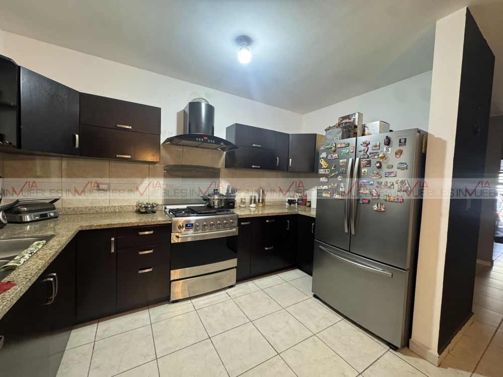 En planta baja cuenta con sala, comedor y cocina integral con cubierta de granito, equipada con estufa, campana y tarja.