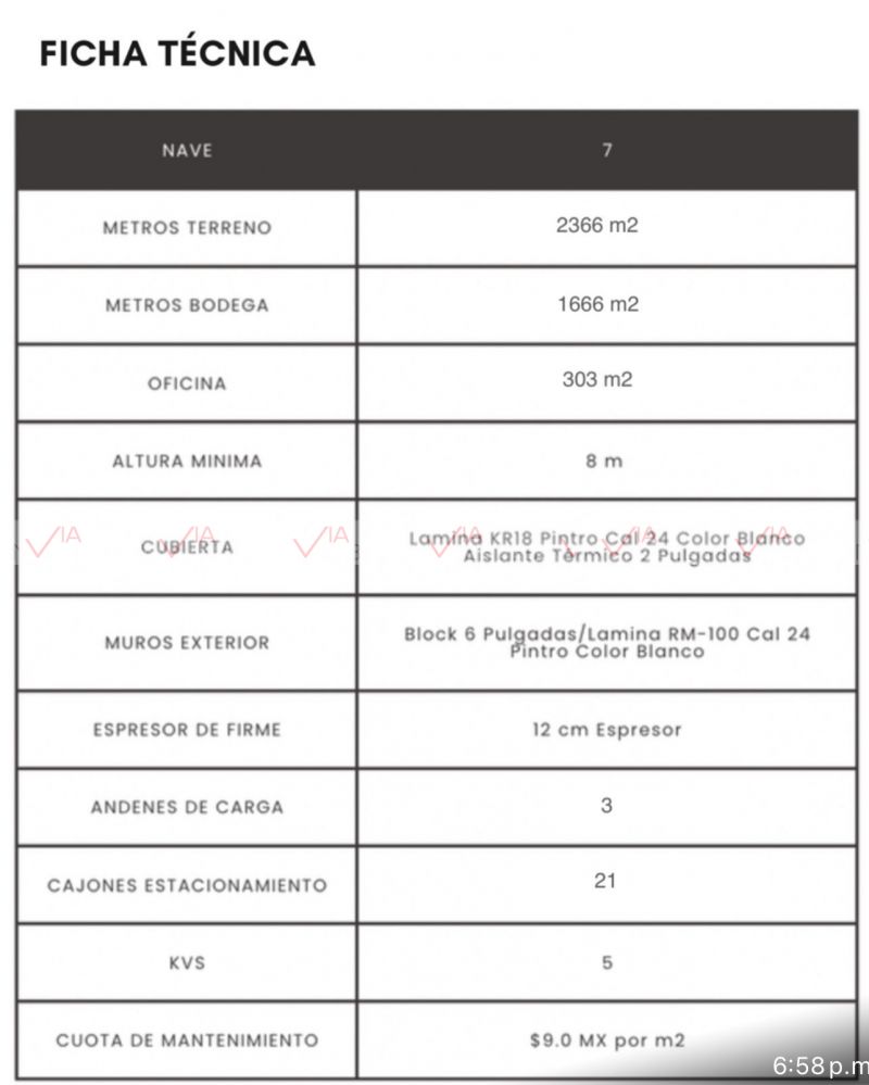 Con 1,666 m2 de bodega y 303 m2 de área de oficina las cuales incluyen 10 medios baños. Total de construcción 1,969 m2. En un lote de 2,366 m2 de terreno. Cuenta con 21 cajones de estacionamiento y 3 Andenes de carga. Servicios de luz y agua. Areas verdes. Limpieza del Parque.