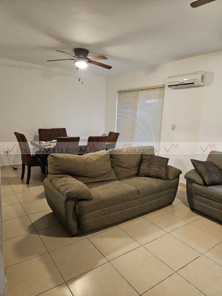 Bonita casa de dos plantas en renta dentro de fraccionamiento privado, zona Carretera Nacional. Con buenos accesos, cerca de centros comerciales, escuelas, hospitales. La casa tiene 3 recámaras con baño, abanicos, closets y minisplit, 2 cajones de estacionamiento, patio y cuarto de servicio, La privada cuenta con un hermoso parque, y caseta de seguridad.