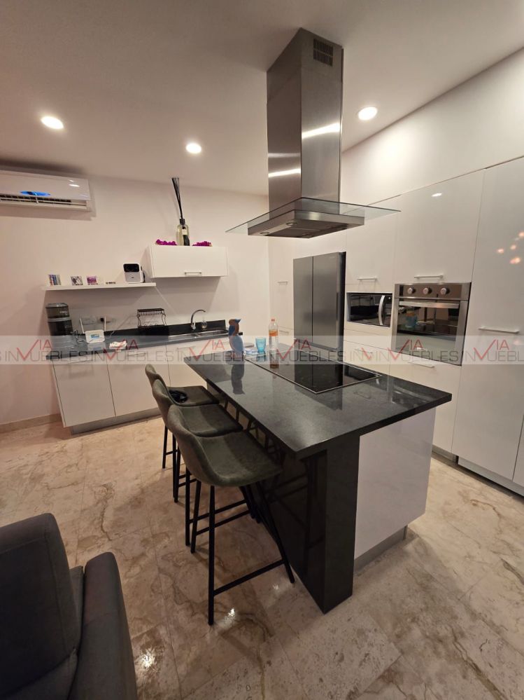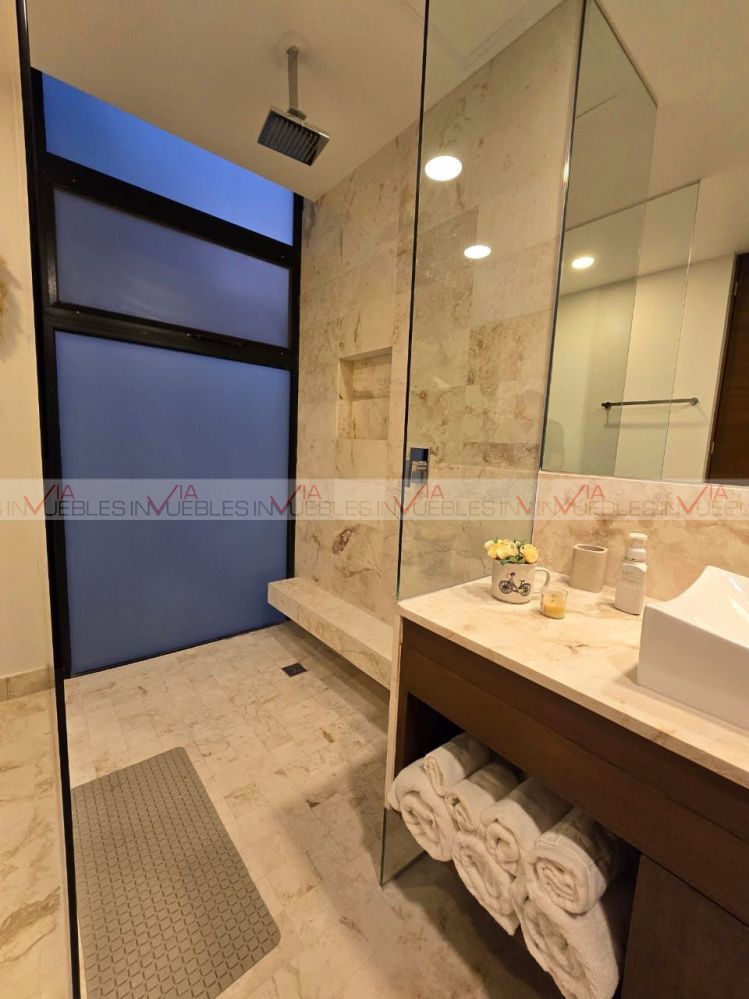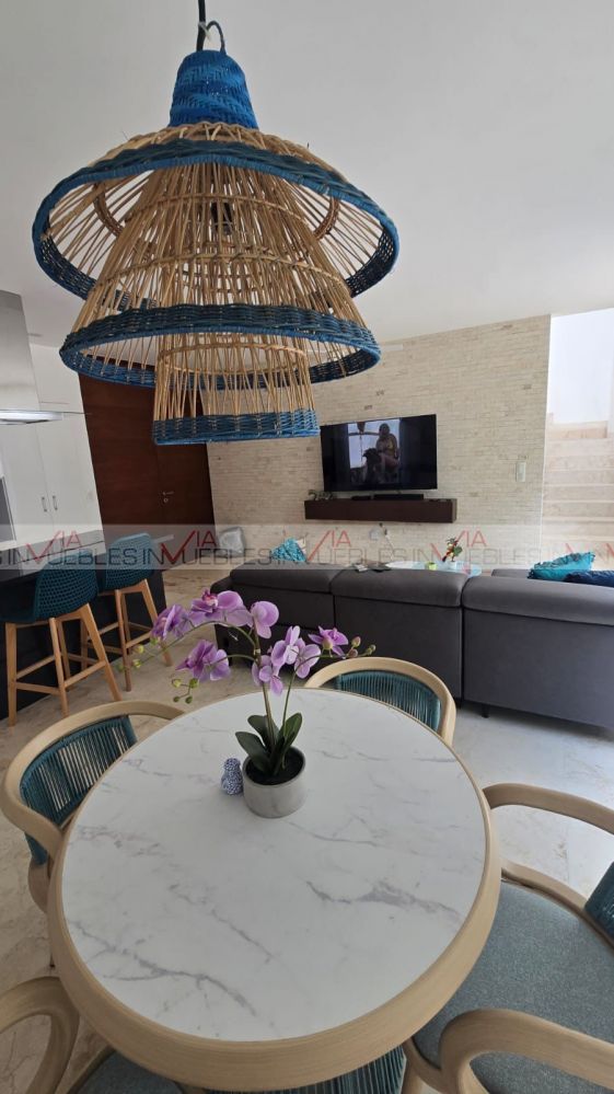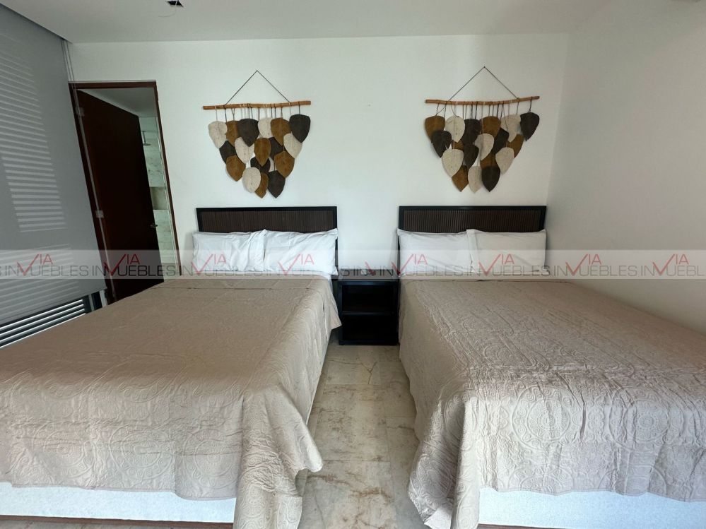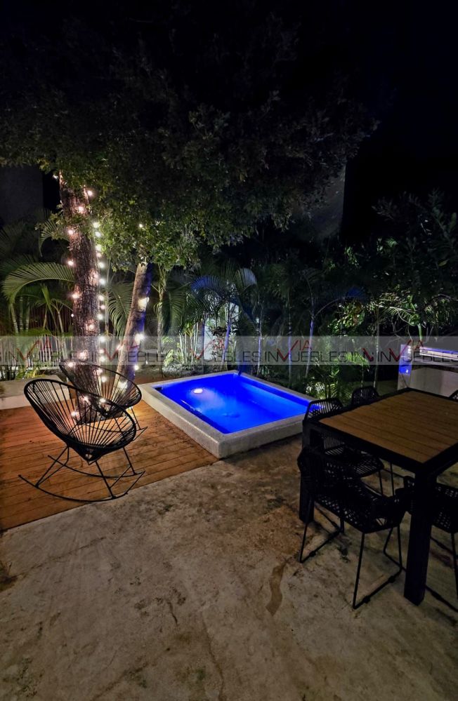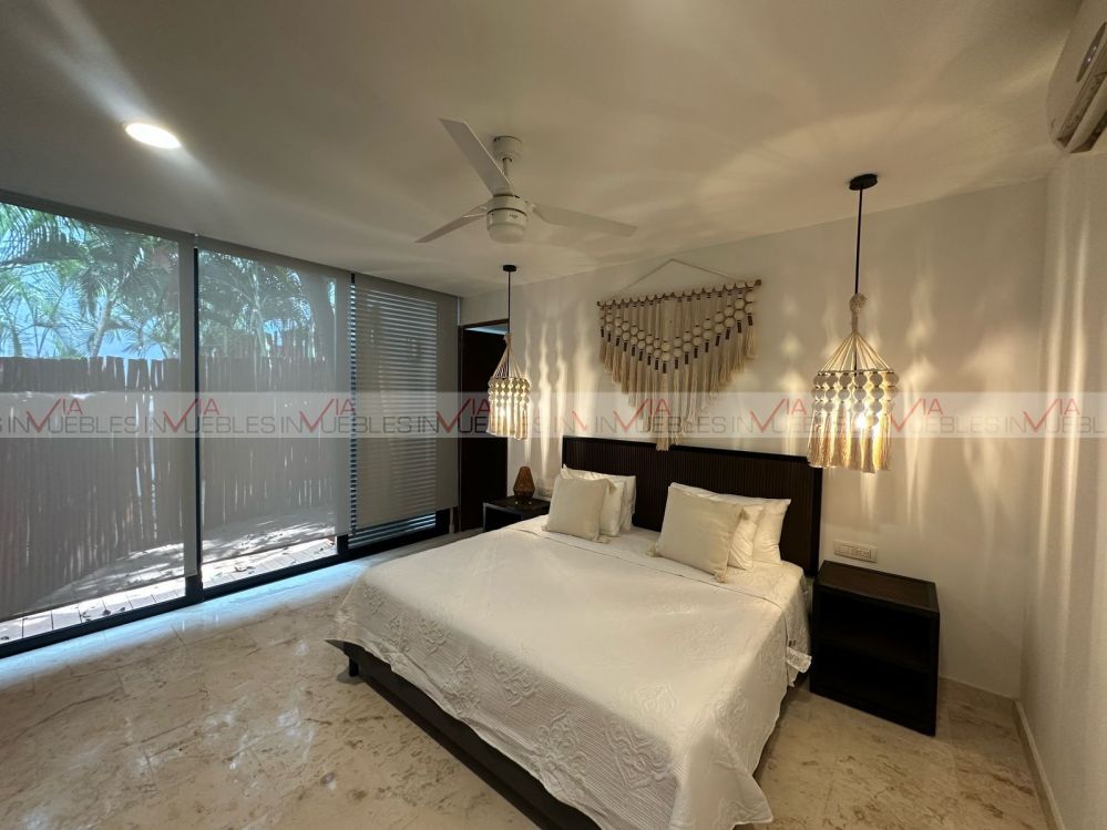 La villa cuenta en planta baja cocina integral con refrigerador, horno, microondas, parrilla eléctrica, comedor para 4, barra desayunador, sala en L con pantalla tv, medio baño, suite con cama king size, pantalla tv c/baño completo c/ cancelería y vestidor. Planta alta recamara con dos camas matrimoniales, baño completo con cancelaría y vestidor. Cuenta con tres terrazas dos en planta baja, primera con regadera exterior y mesa de jardín para dos, terraza dos trasera (tipo patio) c/asador, muebles de jardín & jacuzzi c/acabado veneciano, terraza tres planta alta c/tarja, c/muebles de sala de jardín y barra para 6. Piso de mármol, deck en 2 de sus terrazas, terraza planta alta con pérgola, acabados en pared, así como lambrín en suites. Cuenta con club playa privado KAY, uno de los mas exclusivos del sector, acceso al campo de golf con descuentos especiales, acceso casa club, restaurantes & bares. Campo de Golf catalogado como uno de los mejores campos de golf en México con categoría PGA, T de practica, mini super, terraza Sky con vista al campo del golf, salón de eventos.