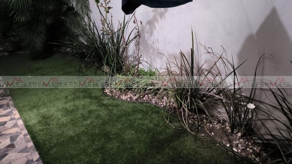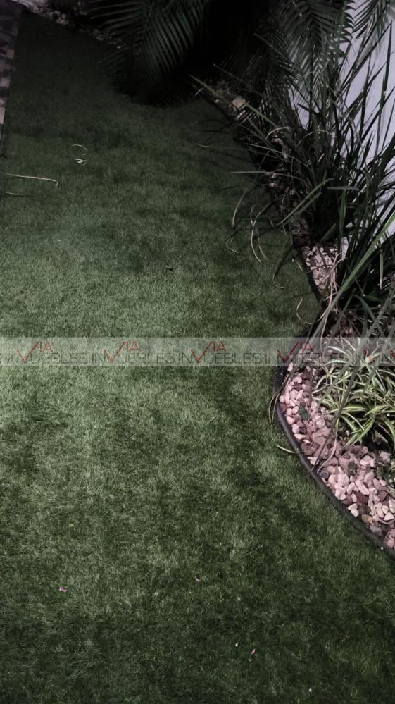 Planta baja con cochera techada para 2 vehículos con portón eléctrico, recibidor, baño de visitas, sala, comedor, cocina con estufa y campana, lavandería y patio con pasto sintético.