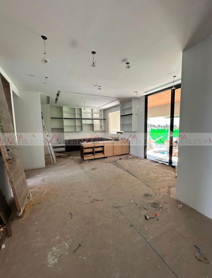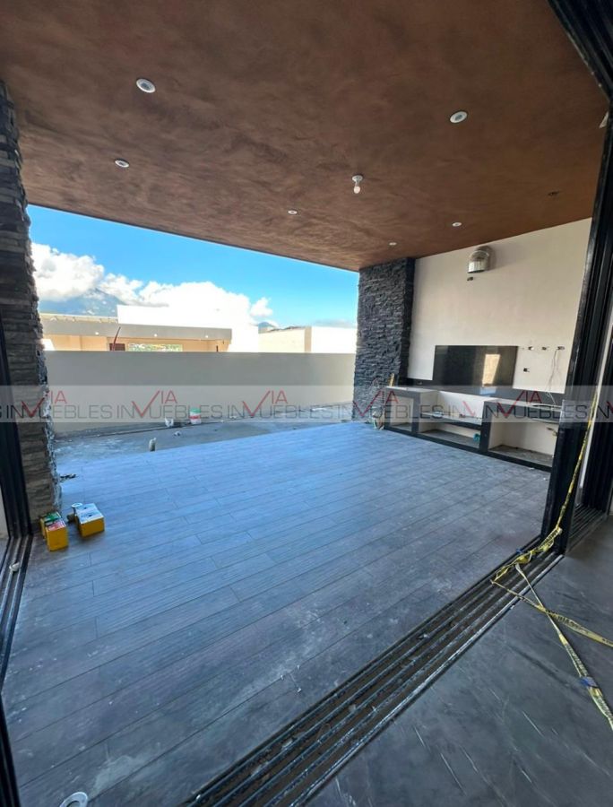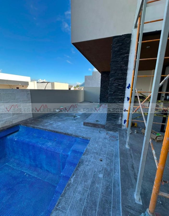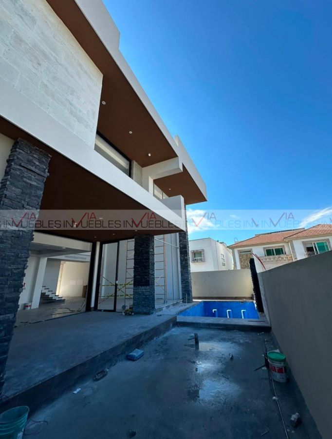Casa en venta en Residencial La Herradura. Se entrega llave en mano en noviembre del 2024. Terreno 500 m². Construcción 837 m² más 92 m² de terraza sin techar. Esta residencia cuenta con las siguientes áreas: Planta baja: cochera para cuatro autos, acceso principal y doble altura en sala y bar, comedor, cocina integral con family room, despensa, baño completo de visitas, sala de cine/estudio/oficina con opción a cuarta recámara, terraza techada con barra cubierta de granito con tarja y preparación de asador, jardín exterior con baño completo, pasillo de servicio, lavandería, cuarto de servicio con baño completo, boiler, alberca y preparación de elevador. Planta alta: recámara principal con balcón, baño completo con hidromasaje y walk-in closet de 2 niveles, 3 recámaras secundarias con balcón, baño completo y walk-in closet cada una, estancia de televisión, closet de blancos y sink. Azotea: cubo, escaleras y elevador para acceso a azotea, terraza techada, baño completo, área social exterior, barra cubierta de granito con tarja y preparación para asador y refrigerador, bodega y área de máquinas (climas, paneles, voz y datos), área social interior con medio baño.