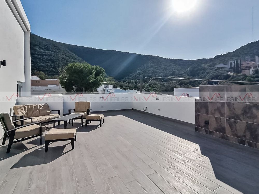 Hermosa casa contemporánea, ubicada en el Cerro de la Silla, rodeada de áreas verdes, hermosos paisajes y vistas espectaculares con fácil acceso a avenidas principales. Características principales: Planta 1, Cochera para 3 carros con portón eléctrico y Bodega, Planta 2 Sala, comedor, cocina, cuarto de alacena y lavandería, así como patio techado para área social, asador con granito y puertas de acero inoxidable, hermosa piscina y 2 medios baños. Pisos de porcelanato brilloso. Planta 3 cuenta con amplia recamara principal, walking closet, baño completo y balcón. Recamara secundaria 1 con baño completo y amplio closet y terraza recamara secundaria 2 con walking closet y baño completo. Área de blancos y lavandería. Todos los closets están nuevos y recién instalados. Planta 3 Recamara de visitas con closet, baño completo, cuarto flex. Mezzanine, así como amplia terraza y 1 cuarto de servicio con baño completo. 175m2 de terreno y 411m2 de construcción