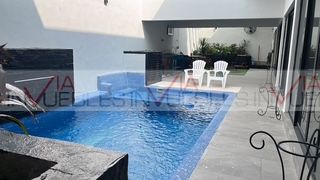 Hermosa casa ubicada al sur de Santiago, con diseño contemporáneo, bellamente amueblada, con vistas a la Sierra Madre, cuenta con alberca, palapa, asador, cochera para 3 autos, acceso por 2 calles, sistema de seguridad, equipada con cocina integral, 3 recámaras cada una con su baño completo y closet, la recámara principal tiene acceso al área de la alberca y las otras 2 recámaras con vistas a la montaña. Casa frente a parque, de beisbol los fierros en el fraccionamiento San Cayetano.