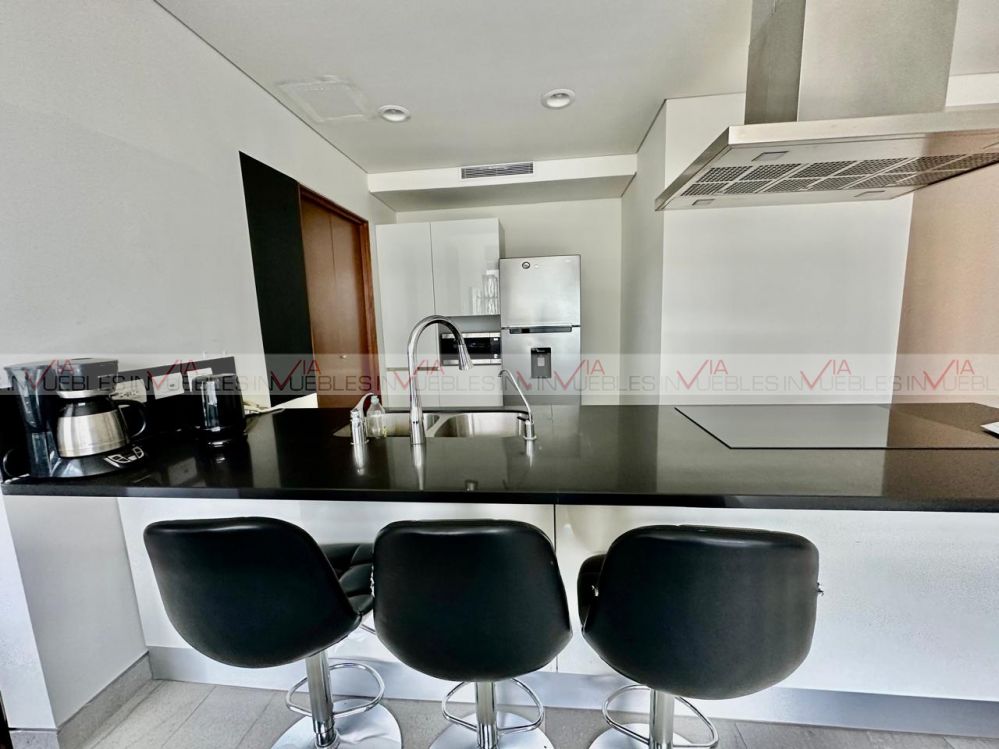Cocina integral equipada la cual tiene una barra desayunadora, amplia área social con vistas espectaculares, lavandería con centro de lavado (lavadora y secadora), clima central.