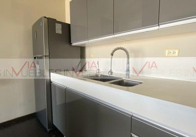 Cuenta con dos recámaras, ambas con walking closet y baño completo, el área social es bastante amplia y con muy buena iluminación gracias a sus ventanales de piso a techo, además tiene salida a un pequeño balcón con una hermosa vista al cerro de la silla. Su cocina de concepto abierto está completamente equipada y cuenta con isla con cubierta de granito.