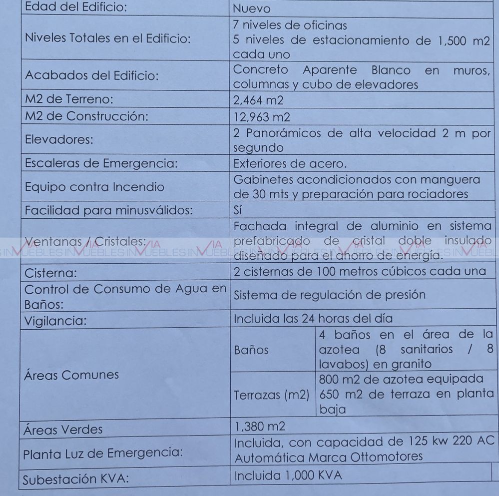 Con una antigüedad de 5 años, esta oficina ofrece 2464 metros de frente y 2464 metros de fondo. Además, incluye un área de verde, terraza y comedor climatizado con baños, planta de luz, equipo y preparación contra incendio, y facilidad de acceso a discapacitados.