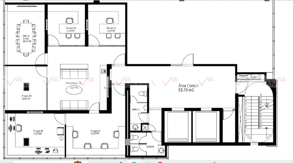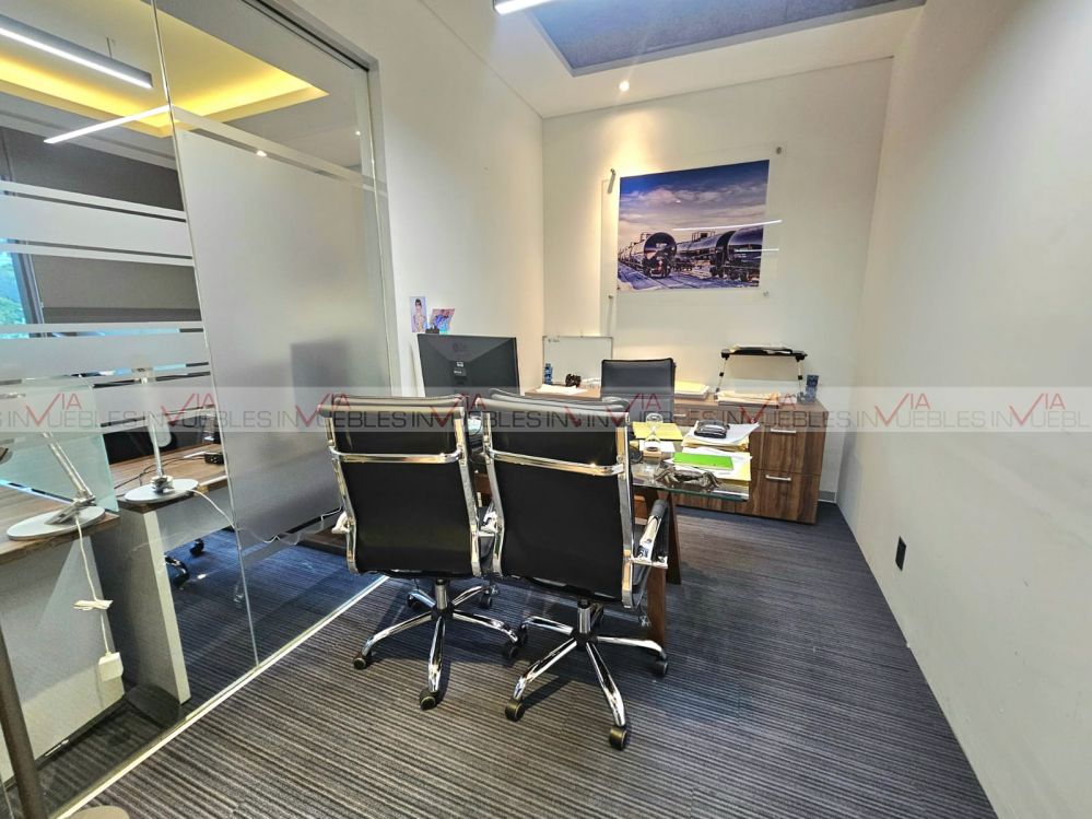 La oficina tiene 2 entradas y se conectan por dentro. Consta de 6 privados, sala de juntas para 10 personas, área abierta que puede ser utilizada como sala o espacio para cowork, coffee station, baños para damas y caballeros en el área común. Le corresponden 8 cajones de estacionamiento con acceso directo a la oficina.