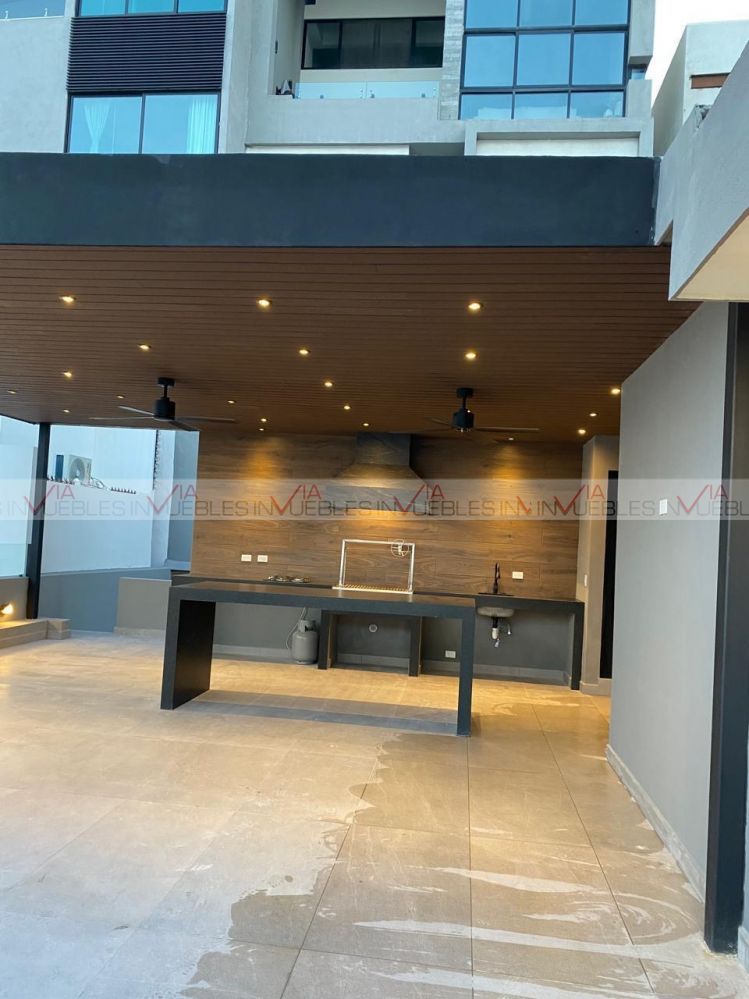 Posee una extensa terraza, equipada con asador y una mesa central de granito, y el área está semi techada y posee medio baño. Los invitados pueden disfrutar de una vista panorámica de la ciudad. La casa cuenta con cuarto de lavandería, cuarto de servicio completo y cochera para 2 autos con portón eléctrico.