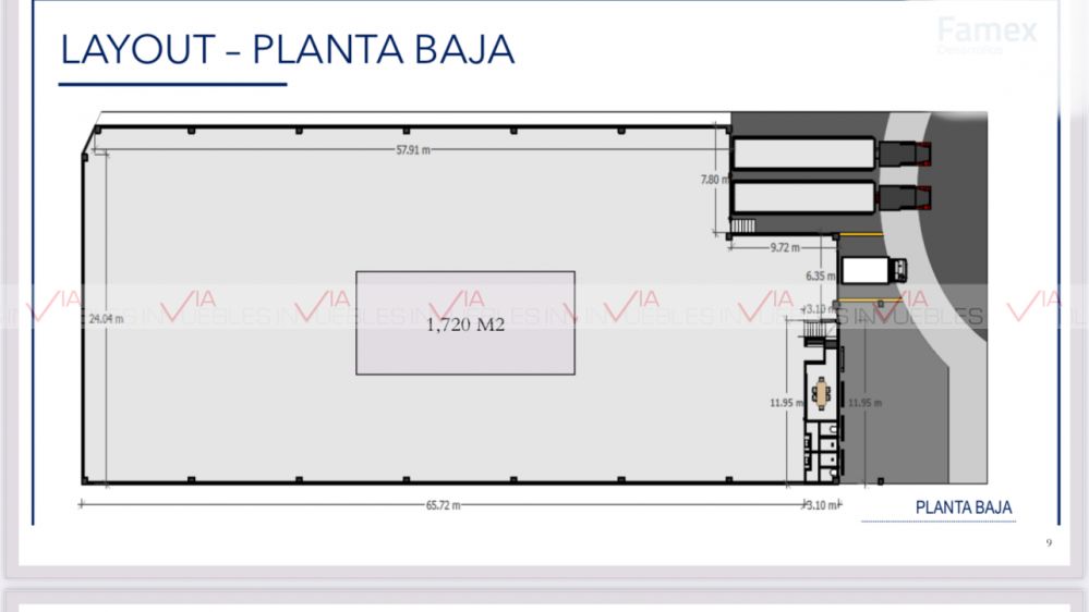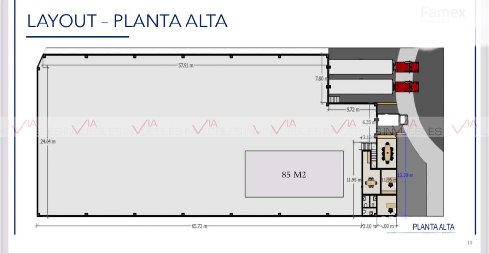 Altura libre de 9 metros, dos baños completos en la planta baja y tres medios baños en la planta alta, cinco cajones de estacionamiento, 85 m² de Oficinas y dos andenes de carga + rampa a nivel de piso.