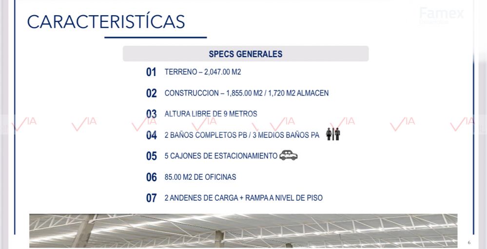 Estacionamiento privado. Altura libre. NPT-CI 9.15 o 30 pies. Baño y vestidor H y M. Flexibilidad para adecuaciones acorde a las necesidades del cliente. MBI (Master Building Insulation) recubrimiento para insolación cubierta superior de 3 pulgadas. Firme de concreto armado de 150 mm, MR-38 armado a base de vr corrugada n.3 con capacidad de carga de 8.00ton x m². 85 m² de área de oficinas, equipadas con W C, hombres, mujeres y comedor. Lámina Kr-18. Muros de Block. $19,500m2 de Construccion