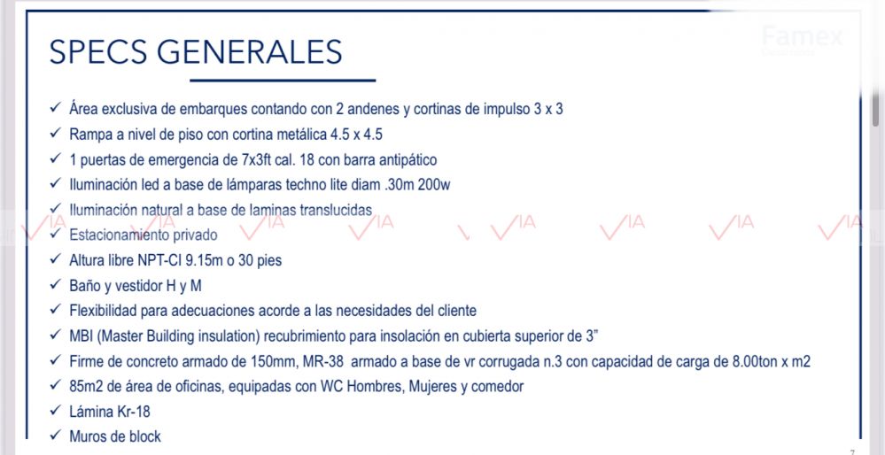 Specs Generales: Áreas exclusiva de embarques contando con dos andenes y cortina de impulso 3 × 3. Rampa a nivel de piso con cortina metálica 4.5 X 4.5. Una puerta de emergencia de 7 X 3ft cal. 18 con barra antipático. Iluminación LED a base de lámparas tecno Light. Diámetro. 30 m 200w. Iluminación natural, base de láminas traslúcidas.