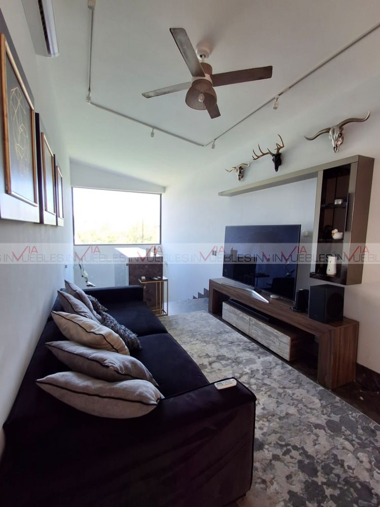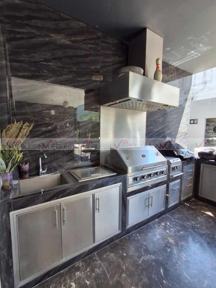 Primer planta: Hermoso recibidor de doble altura, amplia área de sala con grandes ventanales que brindan de muy buena iluminación con salida a terraza. Cocina integral de concepto abierto completamente equipada, con barra de granito con estufa central y espacio para 5 comensales. Hermoso comedor con espacio para 10 comensales con salida al área social exterior, ideal para integrar ambos espacios y tener reuniones de mayor aforo. El área exterior cuenta con una zona de bar/asador con acabados de acero inoxidable, alberca y jacuzzi con sistema de hidromasaje, fogatero y baño completo.