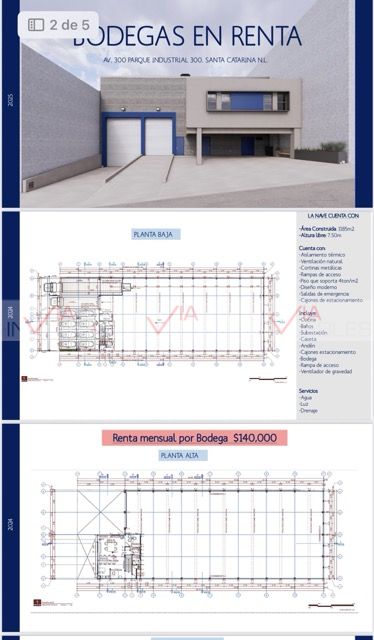 Bodega industrial en renta dentro de parque industrial, 300 en Santa Catarina, área construida de 1185m, altura libre de 7.50 m, la bodega cuenta con aislamiento térmico, ventilación natural, cortinas metálicas, rampas de acceso, piso que soporta 4 ton/m2, diseño moderno, salidas de emergencia, cajones de estacionamiento, cocina, baños, luz, agua y drenaje ideal para iniciar tu propia empresa.