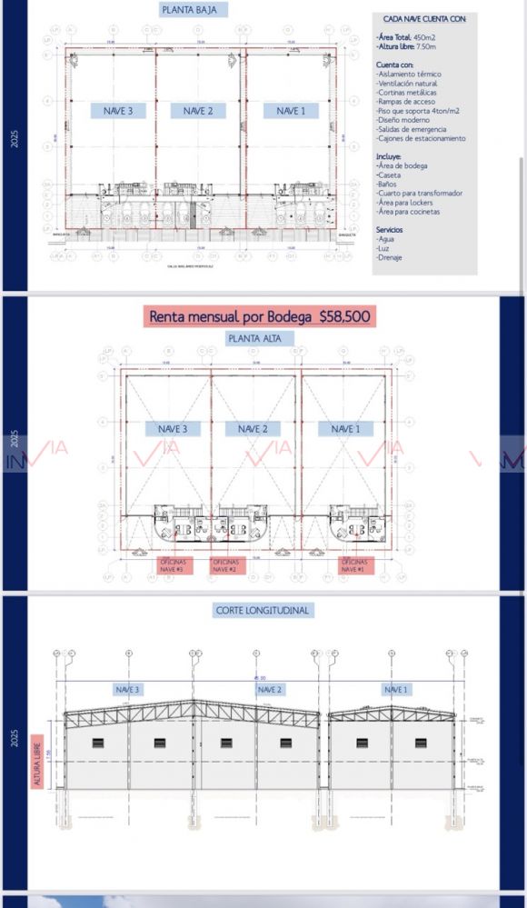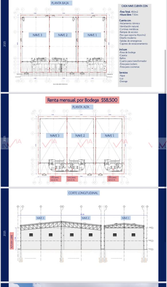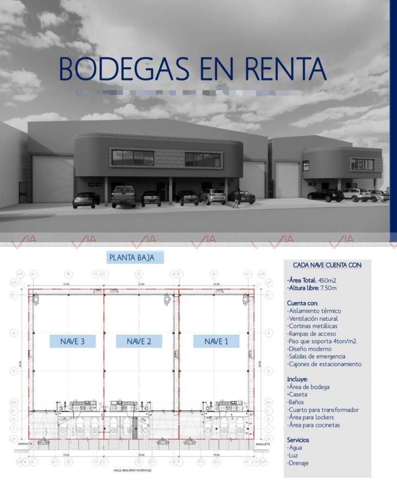 Bodega en renta en Guadalupe, son 3 naves, la nave 1 está disponible, cuenta con un área total de 450 m2, altura libre de 7.50m, cuenta con aislamiento térmico, ventilación natural, cortinas metálicas, rampas de acceso, piso que soporta 4 toneladas, diseño moderno, salidas de emergencia, cajones de estacionamiento, tiene oficinas, cuarto de transformador, lockers, entrada a portón, camión de 31/2.