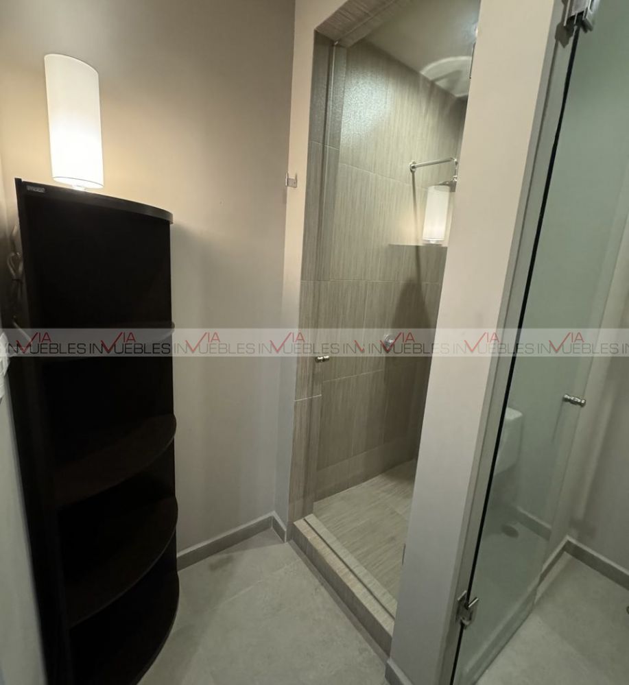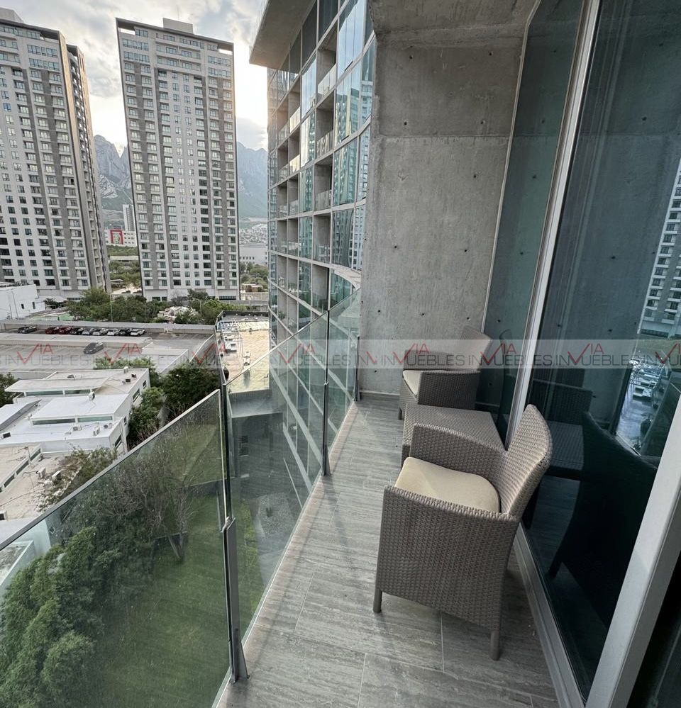 El área social es muy amplia y tiene un balcón con vistas panorámicas a la Huasteca desde el piso 8 de la torre. La recámara cuenta con clóset de pared, baño completo con canceles. El departamento posee 2 minisplit frío/calor, 2 abanicos, 2 televisiones y persianas.