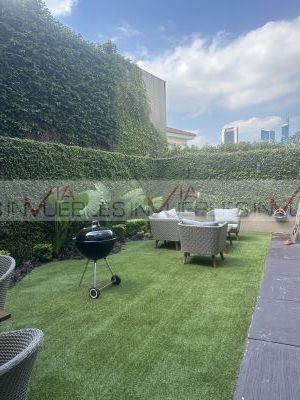 Área social con muebles empotrados en maderas finas y bufetero con cubierta en cuarzo, integrada a un jardín de aproximadamente 50m2.
