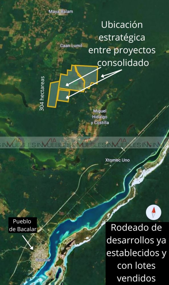 Se ofrece en venta terreno de 304 hectáreas en Bacalar, Quintana Roo, un destino turístico consolidado desde 2011 y con un crecimiento inmobiliario acelerado alrededor de la Laguna de los Siete Colores, sus cenotes, canales de los piratas, centro histórico y hoteles boutique.