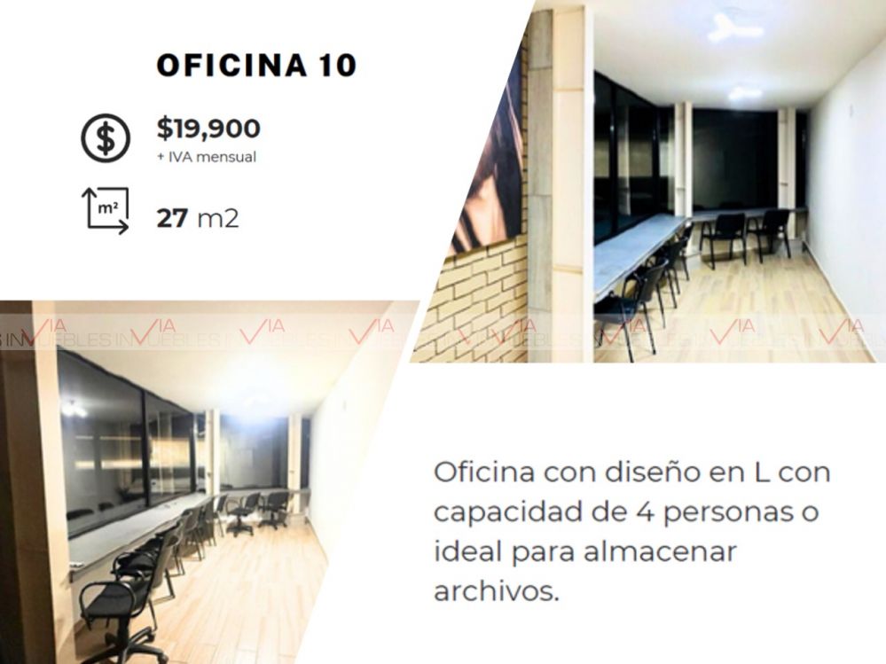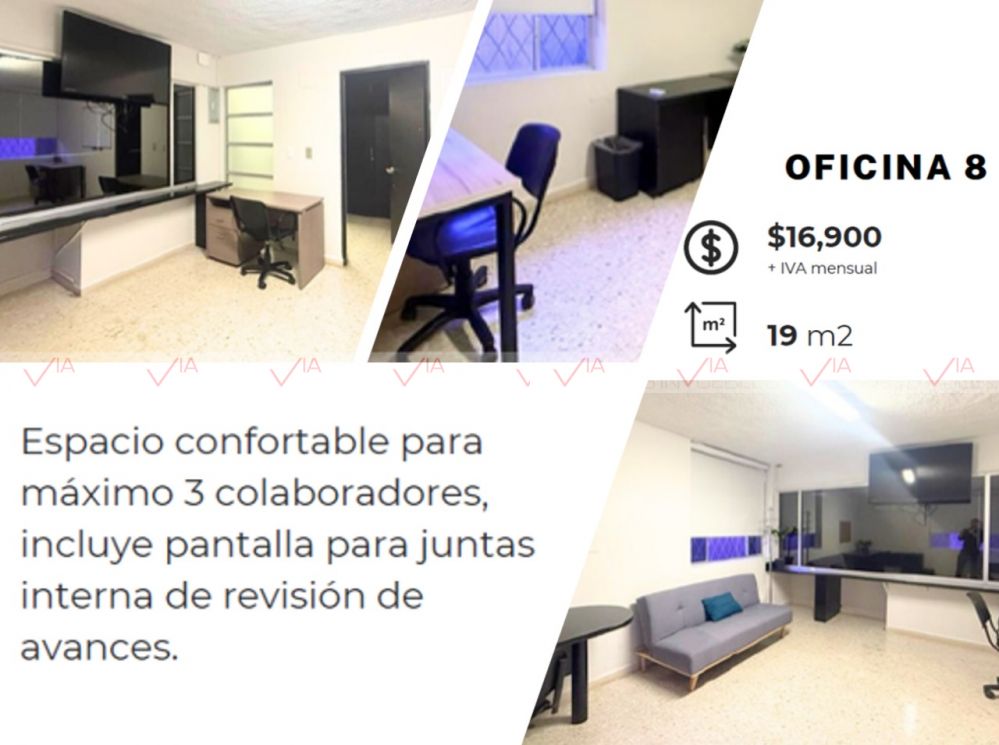Elige la oficina privada que más se adapte a tus necesidades y disfruta de amenidades compartidas en un ambiente tipo coworking: recepción, sala de juntas, cocineta, baños y área al aire libre.