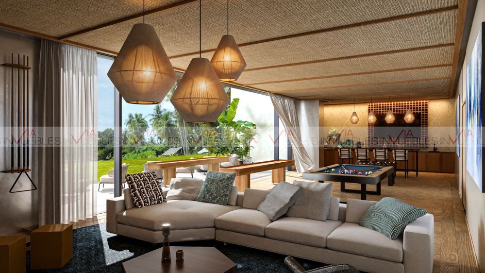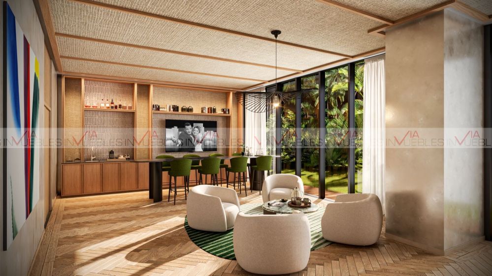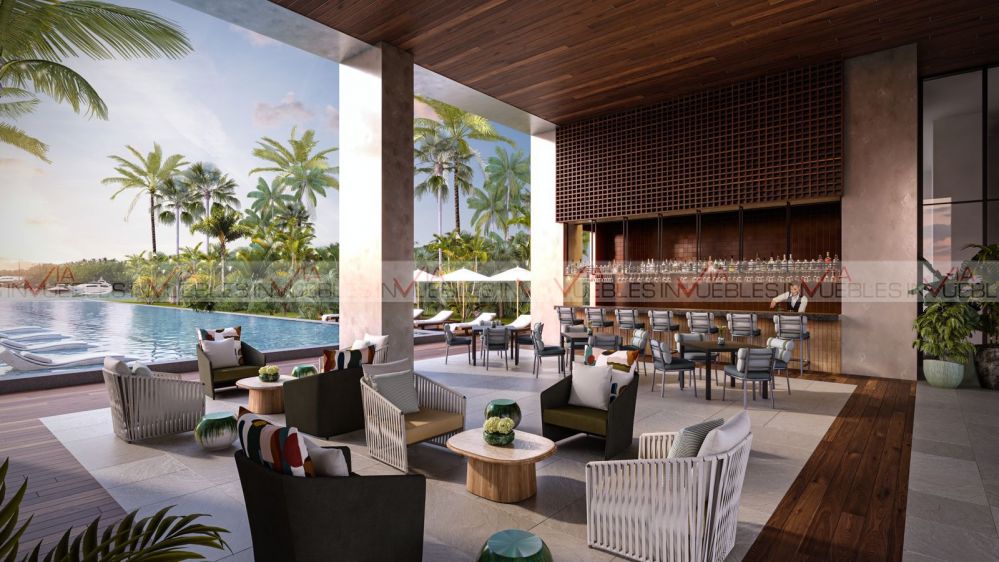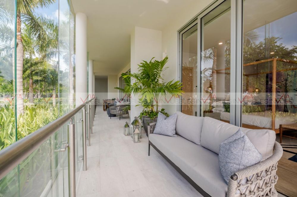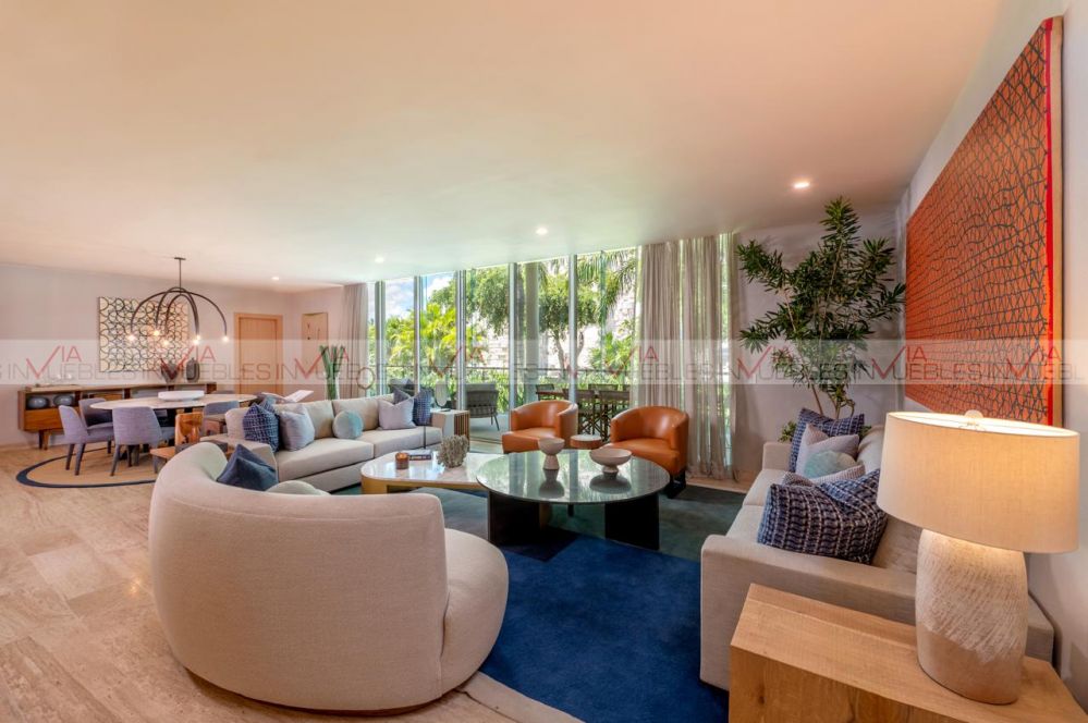 Departamento con vistas inigualables al caribe, distribución inteligente, elevador con acceso controlado que llega a la puerta de su habitación, plafones, amplias terrazas, ventanas panorámicas resistentes a huracanes, Cocina equipada con parrilla 5 quemadores, refrigerador, microondas, horno, tarja de marca Smeg, Carpinteria italiana de cocina, baños y puertas, Cristal templado en ventanas y canceles de baño, Accesorios de baño Hansgrohe, Lavamanos Villeroy & Boch, Pisos de mármol travertino, Aire acondicionado fan & coil central, Calentador cocina con diseño italiano, con cubierta de piedra, equipado, pisos de mármol premium, baños de lujo con tocador, doble lavabo, cuarto de servicio, dos cajones de estacionamiento y bodega, amenidades con alberca, club infantil, playa, asadores, campo de mini golf, valet parking 24/7