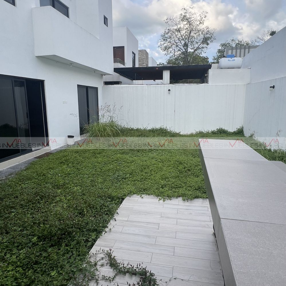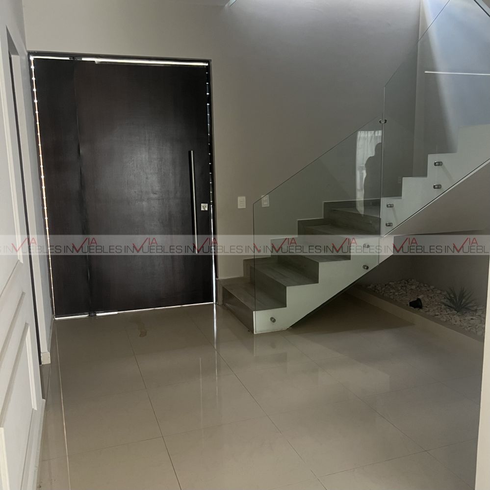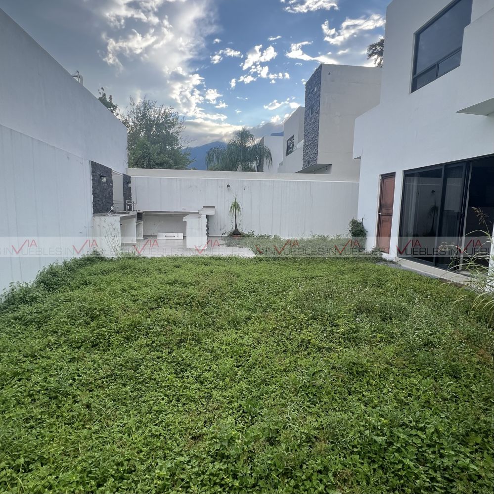 Renta esta hermosa casa en el Cercado Santiago, N.L., con una construcción de 300 metros cuadrados en un terreno de 230 metros cuadrados. Con 3 amplias recámaras, cada una con balcón, minisplits, abanicos de techo, baño completo y walking closet, esta propiedad cuenta cocineta equipada con parrilla, campana, micro ondas, horno y refrigerador, lavandería con centro de lavado, boiler y cámaras de seguridad, cortinas y candiles en sala comedor, persianas black out en recámaras y family room. Amplio patio con barra de concreto, tarja y asador, 2 cajones de estacionamiento. Se aceptan mascotas. Disfruta de esta casa con todas las comodidades y hermosas vistas frente a parque.