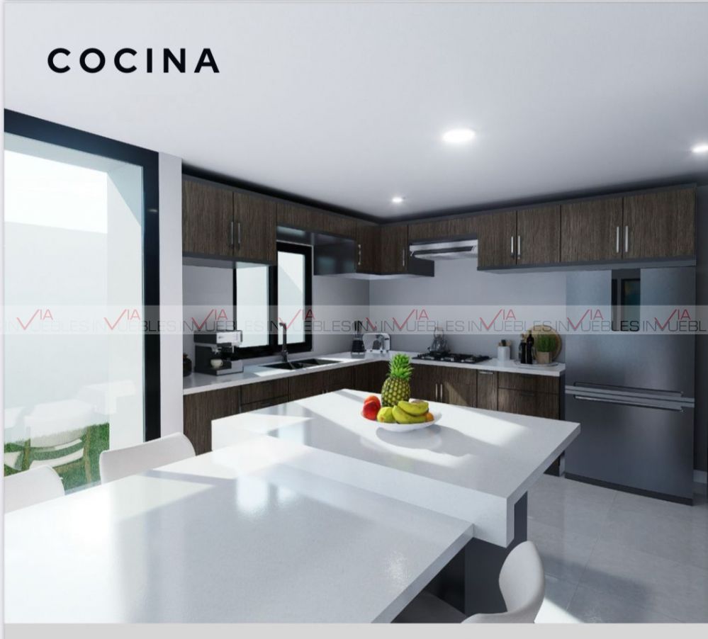 Planta Baja: cochera doble, baño de visitas, sala, comedor, amplia cocina y patio.
