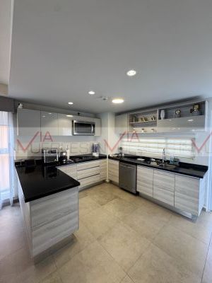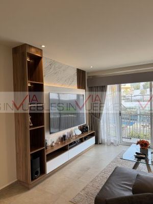 El departamento cuenta con puerta de seguridad con chapa inteligente, tiene muy bonita cocina integral de Cuarzo, refrigerador Samsung de 25 pies, lavavajillas, parrilla con 5 quemadores, lavandería con lavadora y secadora Whirlpool (centro de lavado), sala con mueble para pantalla empotrable con iluminación trasera y lateral con intensidad regulable y comedor con candil, terraza con maravillosa vista a la montaña. 2 recamaras, la recámara principal tiene walk in closet y baño completo con cancel de cristal en la regadera y vista a la montaña. La recámara secundaria comparte baño completo con el área social. Tiene un amplio clóset para blancos.