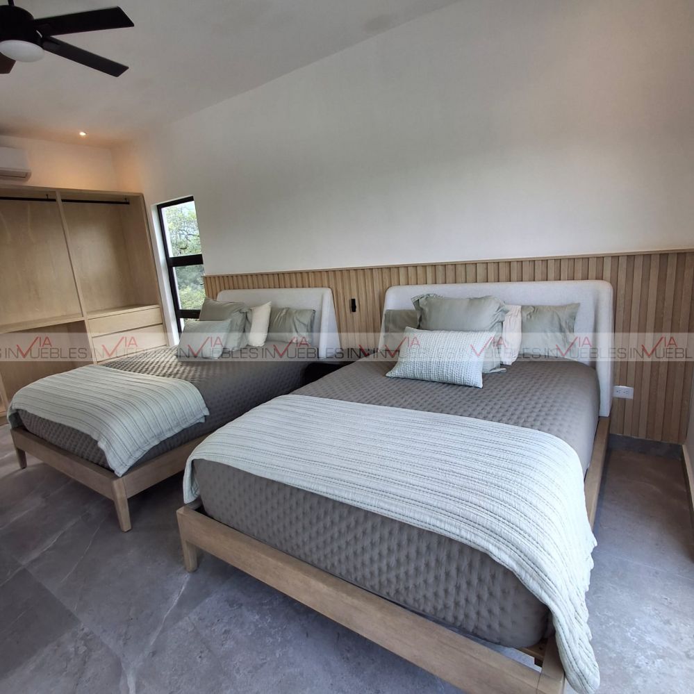 La casa es de dos plantas, en primer nivel se encuentra una amplia área de sala comedor con vista y acceso al jardín. Cocina integral completamente equipada y con isla de gran tamaño. También en planta baja hay un medio baño con hermosos acabados. En segunda planta se encuentra un estudio y la recámara principal con dos camas Queen y su baño completo. La casa incluye proyecto de expansión de 3 recámaras adicionales cada una con su baño completo.