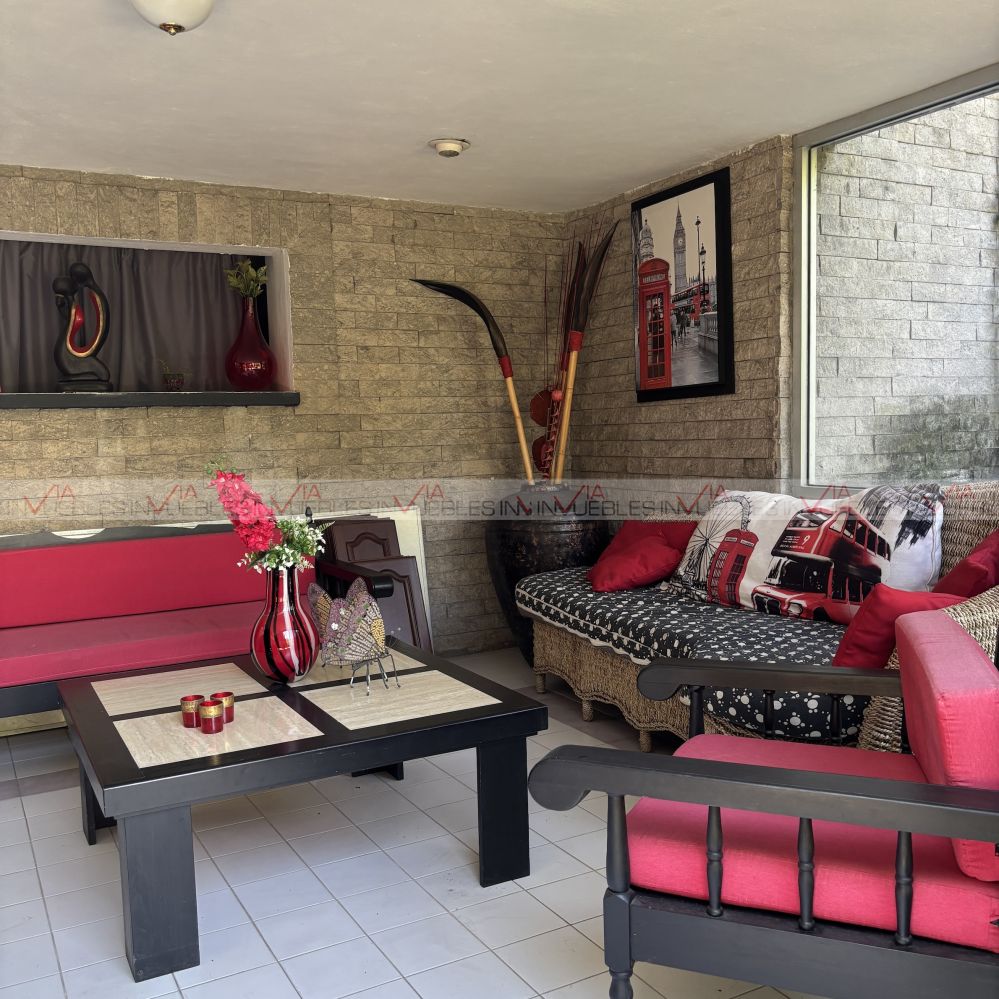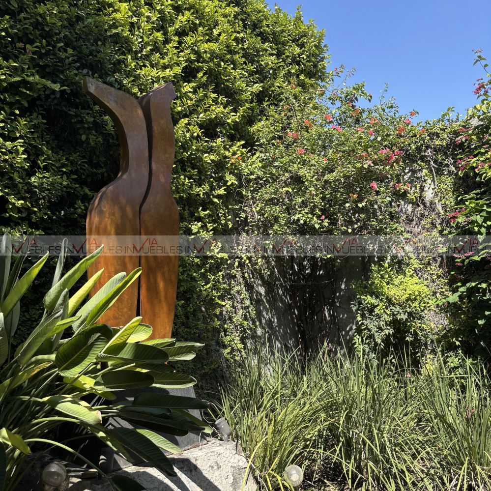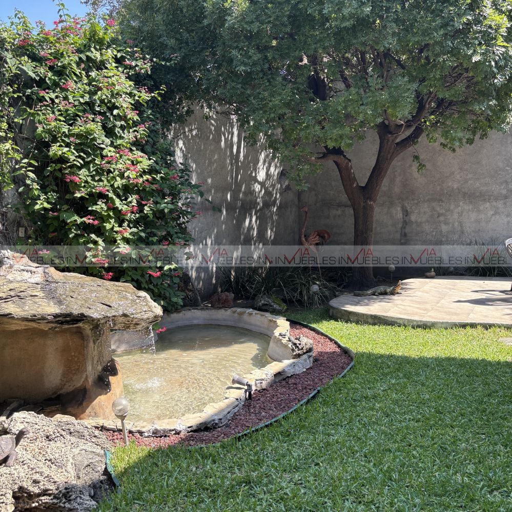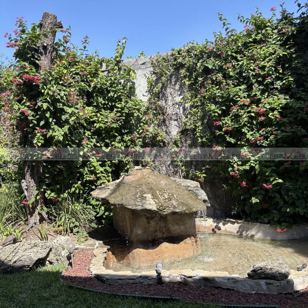 El jardín está en excelentes condiciones con fuente, terraza, hermosa vegetación y árboles; asador, trinchador, pérgola y cuarto de reuniones.