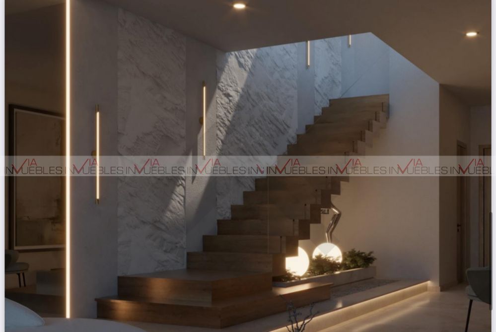 Cuenta con dos niveles de construcción, primer piso cuenta con sala, comedor y cocina. Recamara de visitas en la planta baja con su baño y vestidor, 1/2 medio baño de visitas, cochera para tres autos, cuarto de servicio, lavandería y un amplio jardín posterior. En la parte cuenta con la recamara principal y dos recamaras secundarias con su propio baño. Espacio de estancia y cuarto de estudios.