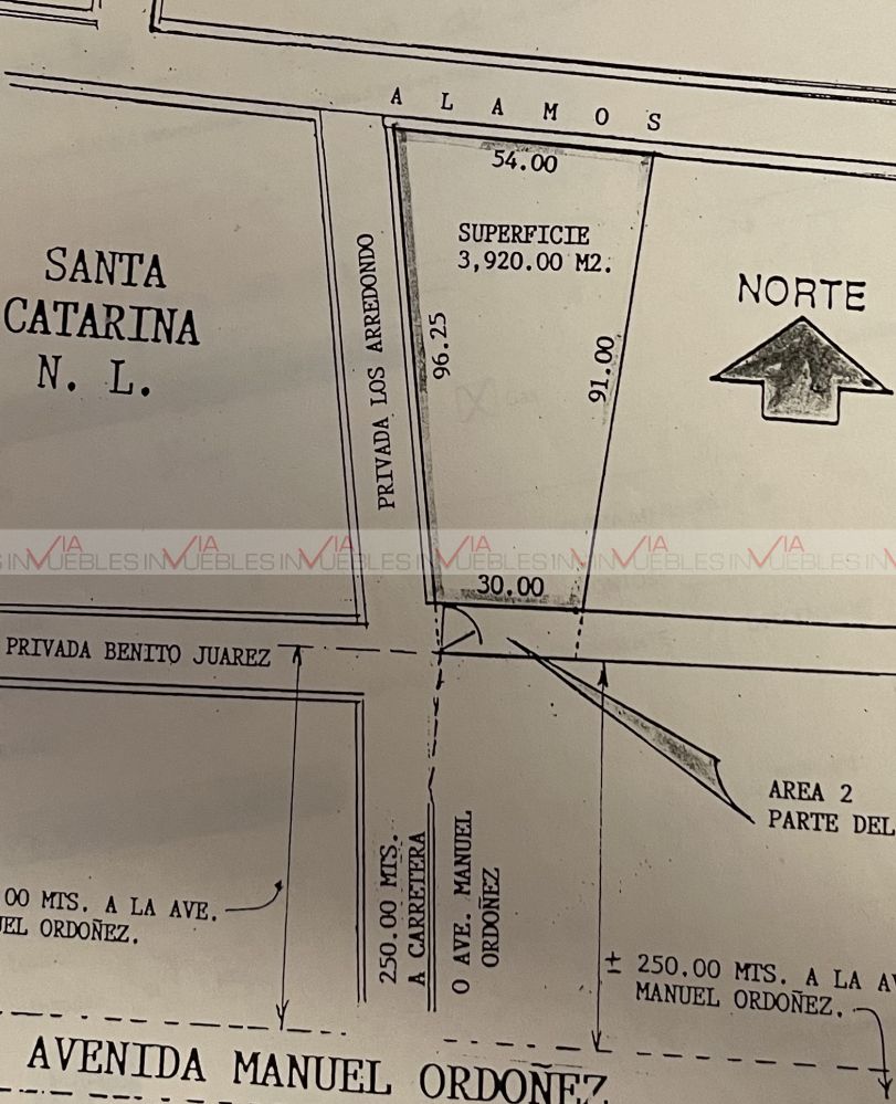 Terreno en venta con una dimensión total de 3,920 mts2, con una forma rectangular y ligeramente irregular; a una cuadra de Avenida Manuel Ordoñez en Santa Catarina.