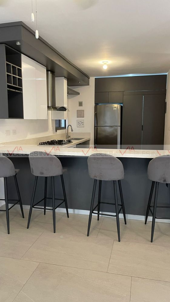 Primer Piso: cochera amplia con capacidad para dos carros, sala comedor, bodega bajo escalera, medio baño para visitas, cocina integral equipada con barra de cuarzo, estufa, horno y campana y refrigerador, patio pasillo acondicionado con pasto sintético.